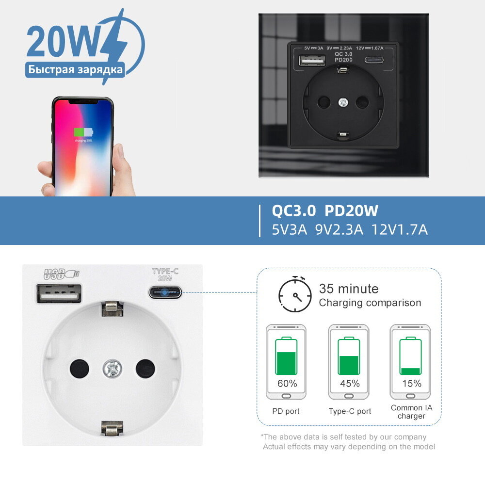 Розетка электрическая тройная с USB и type-C входами, быстрая зарядка 20W, рамка стекло, цвет белый