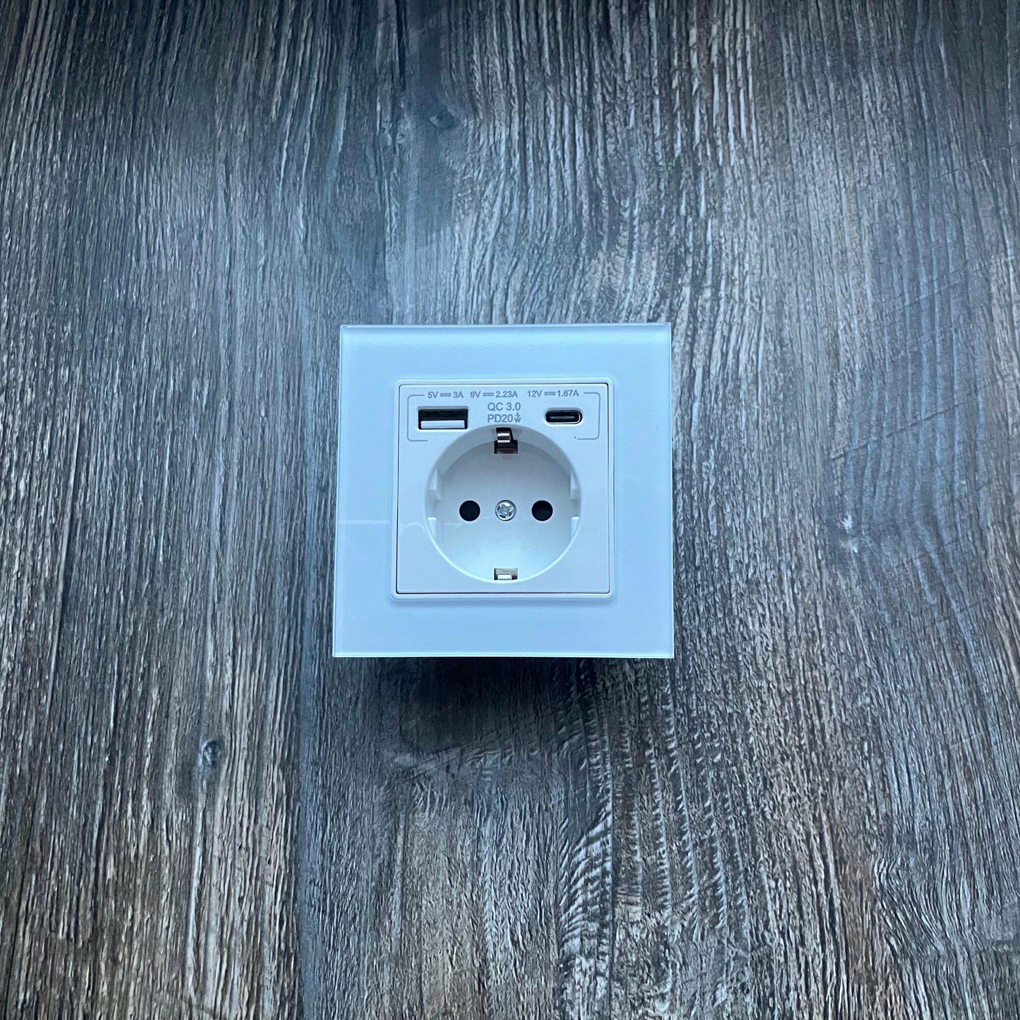 Розетка электрическая тройная с USB и type-C входами, быстрая зарядка 20W, рамка стекло, цвет белый