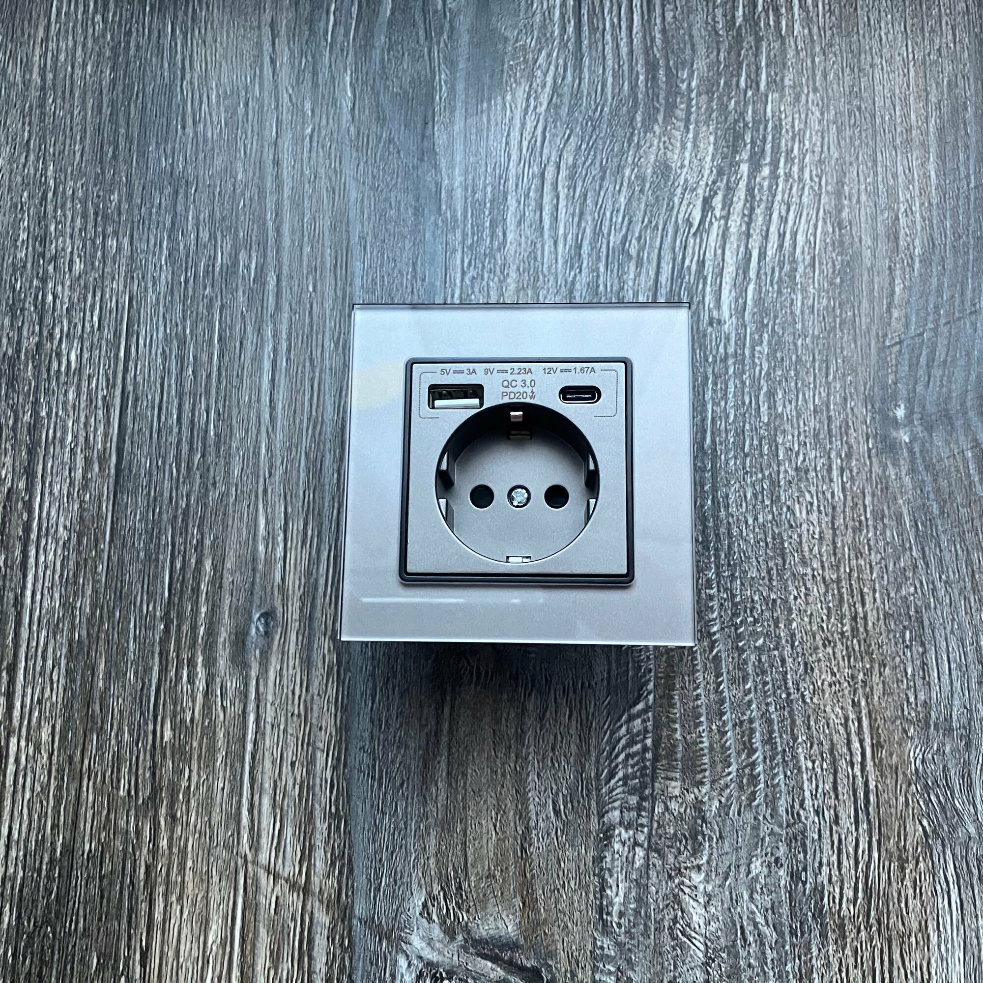 Розетка электрическая тройная с USB и type-C входами, быстрая зарядка 20W, рамка стекло, цвет серый