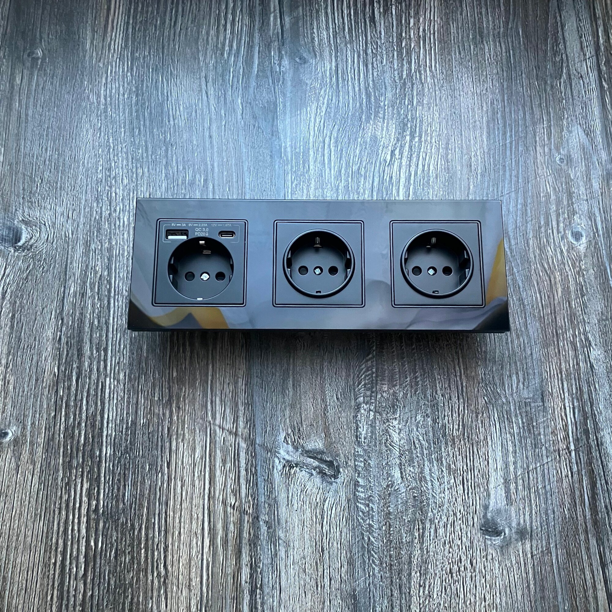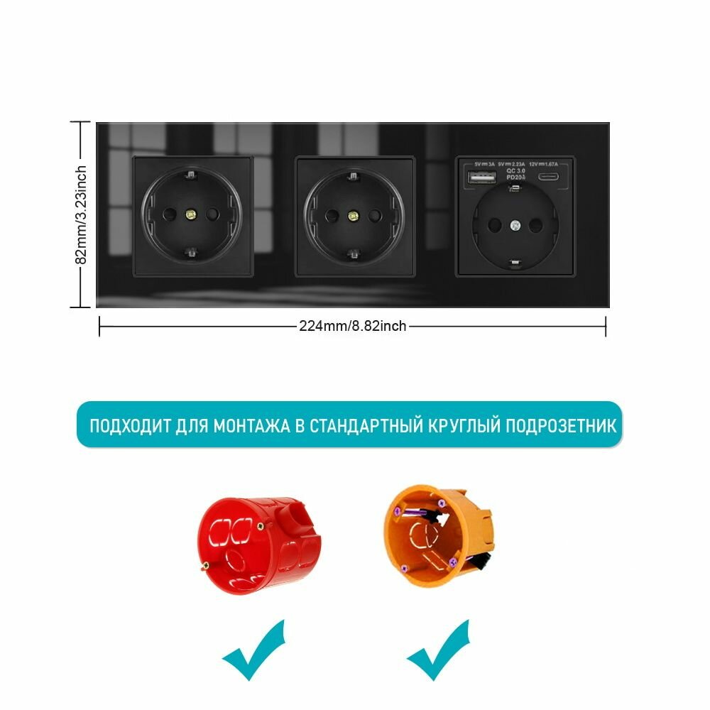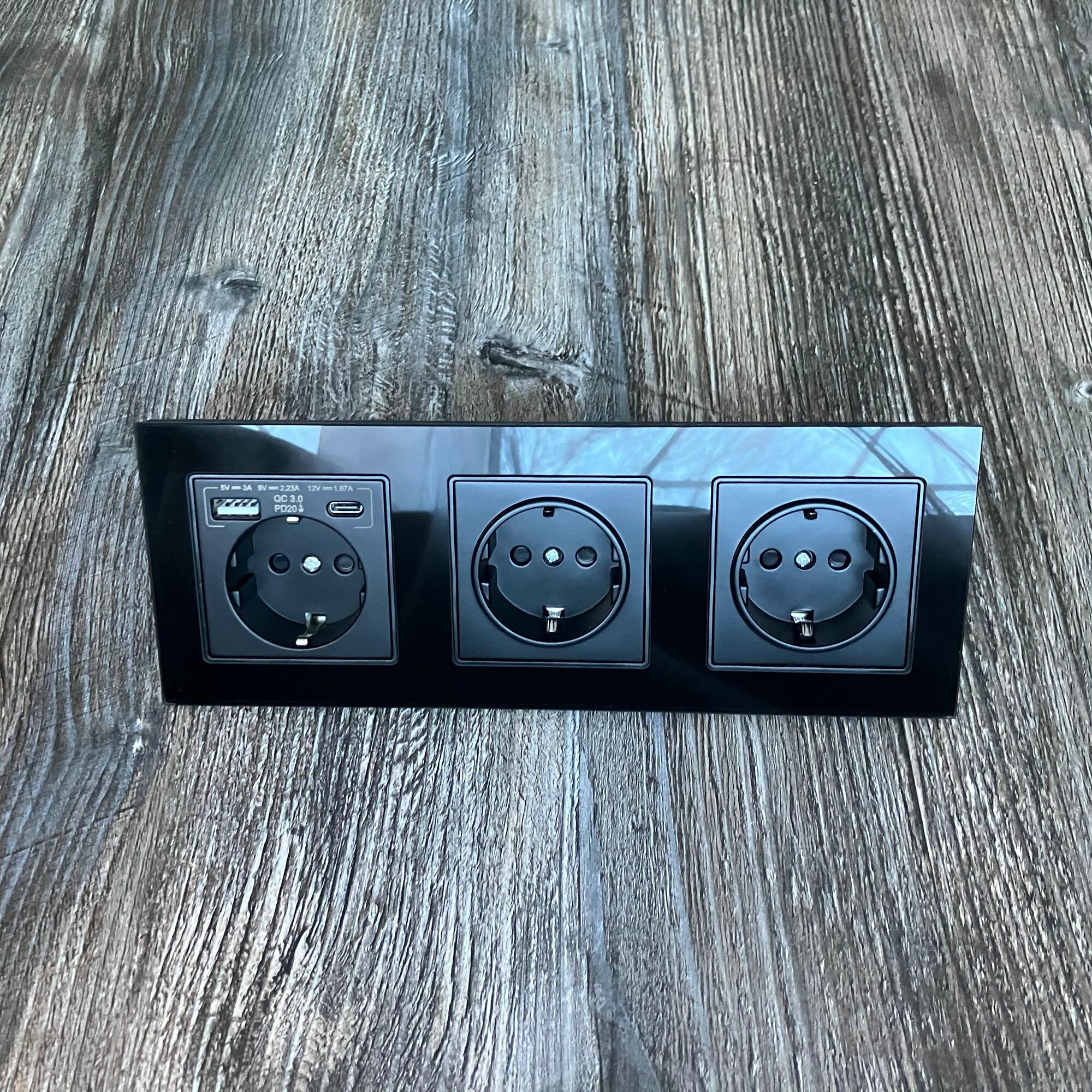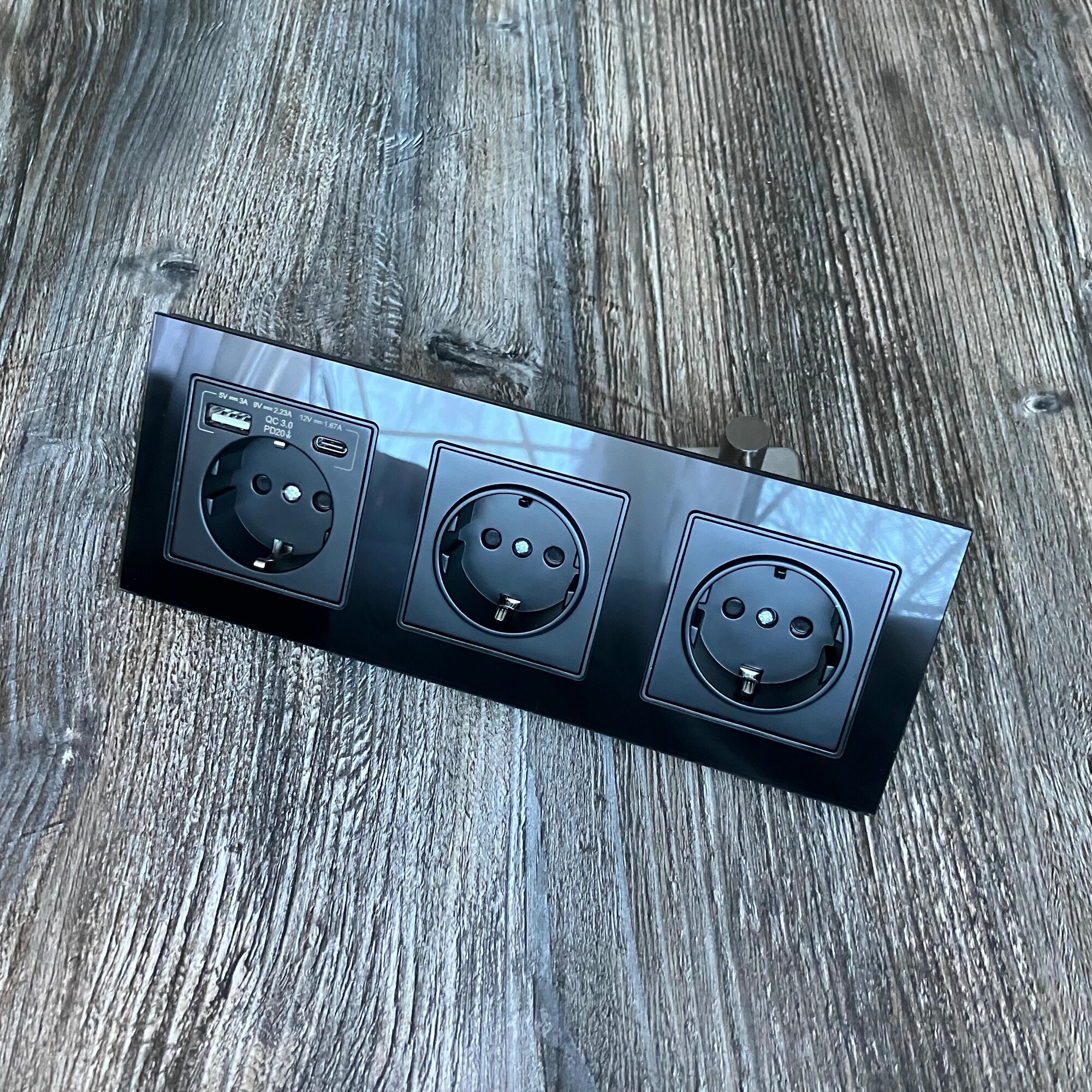 Купить Розетка электрическая тройная с USB и type-C входами, быстрая зарядка 20W, рамка стекло, цвет чёрный
