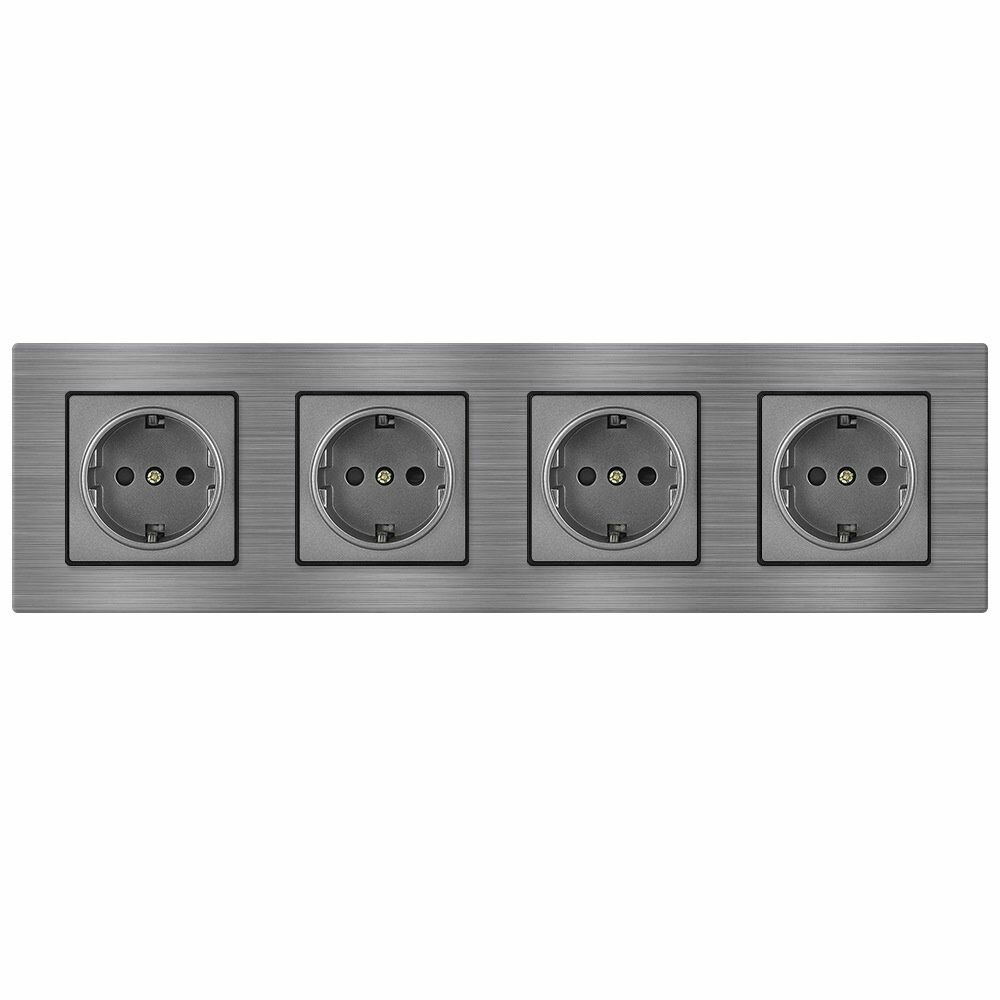 Розетка четверная 4 поста 16А 250В, рамка из металла на 4 поста алюминий, чёрный