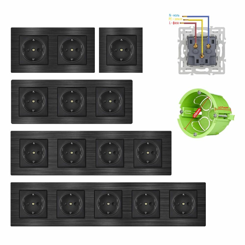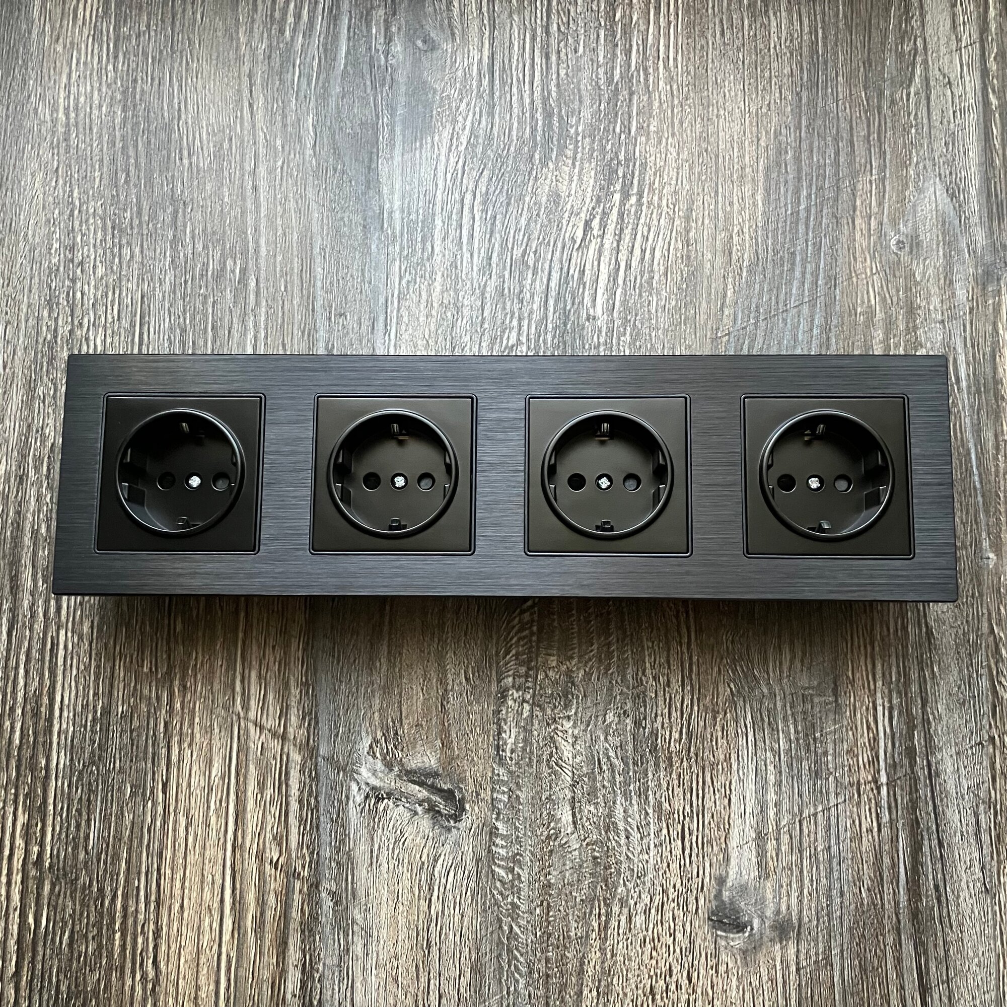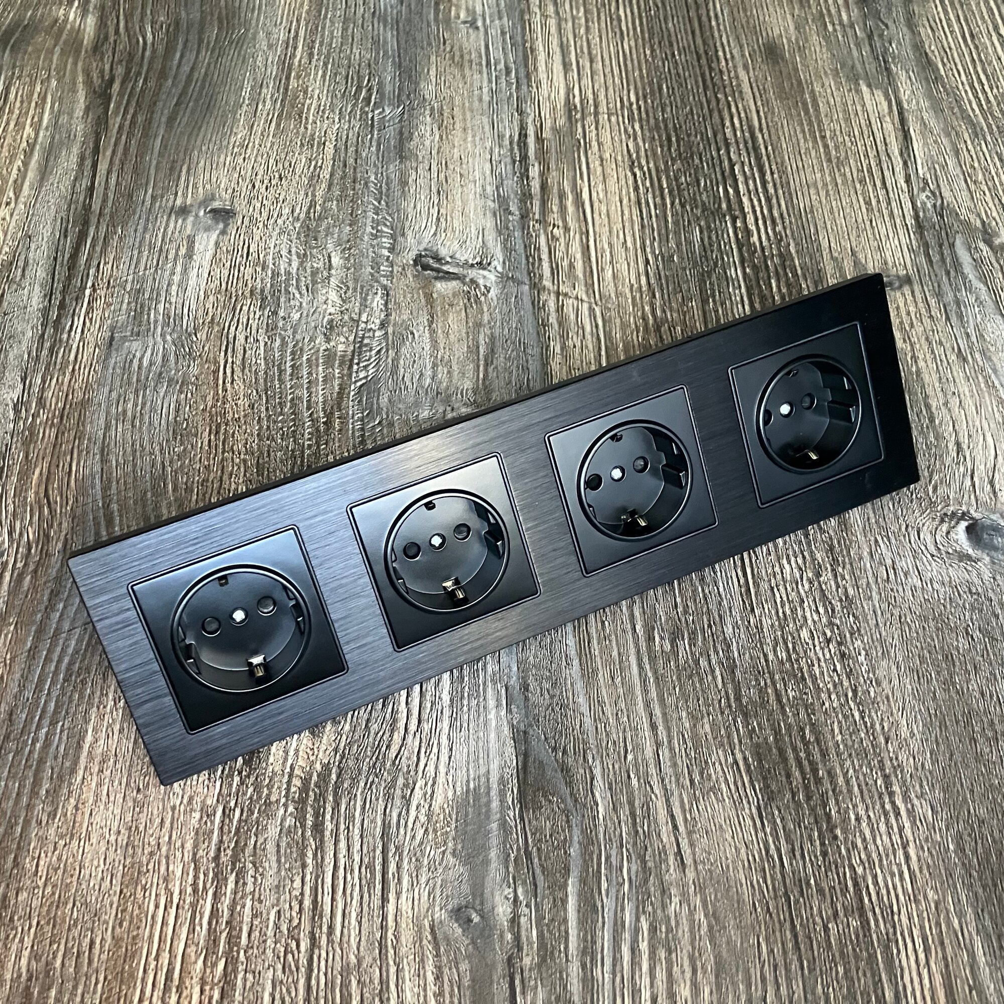Купить Розетка четверная 4 поста 16А 250В, рамка из металла на 4 поста алюминий, чёрный