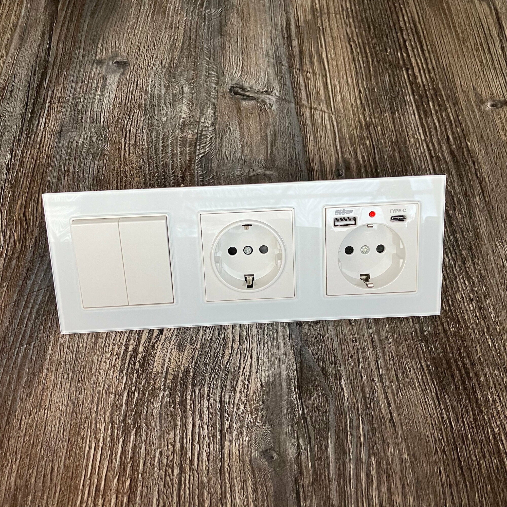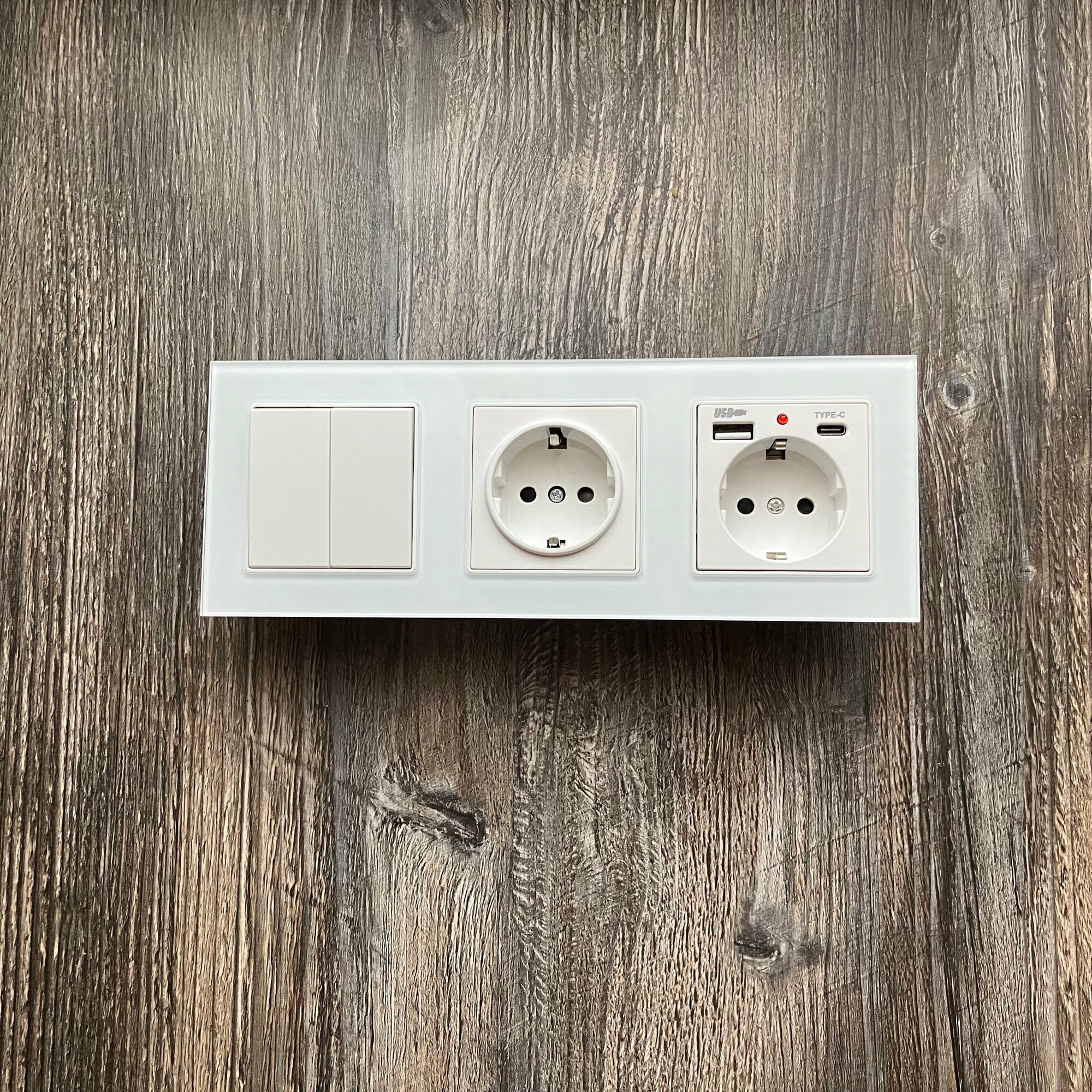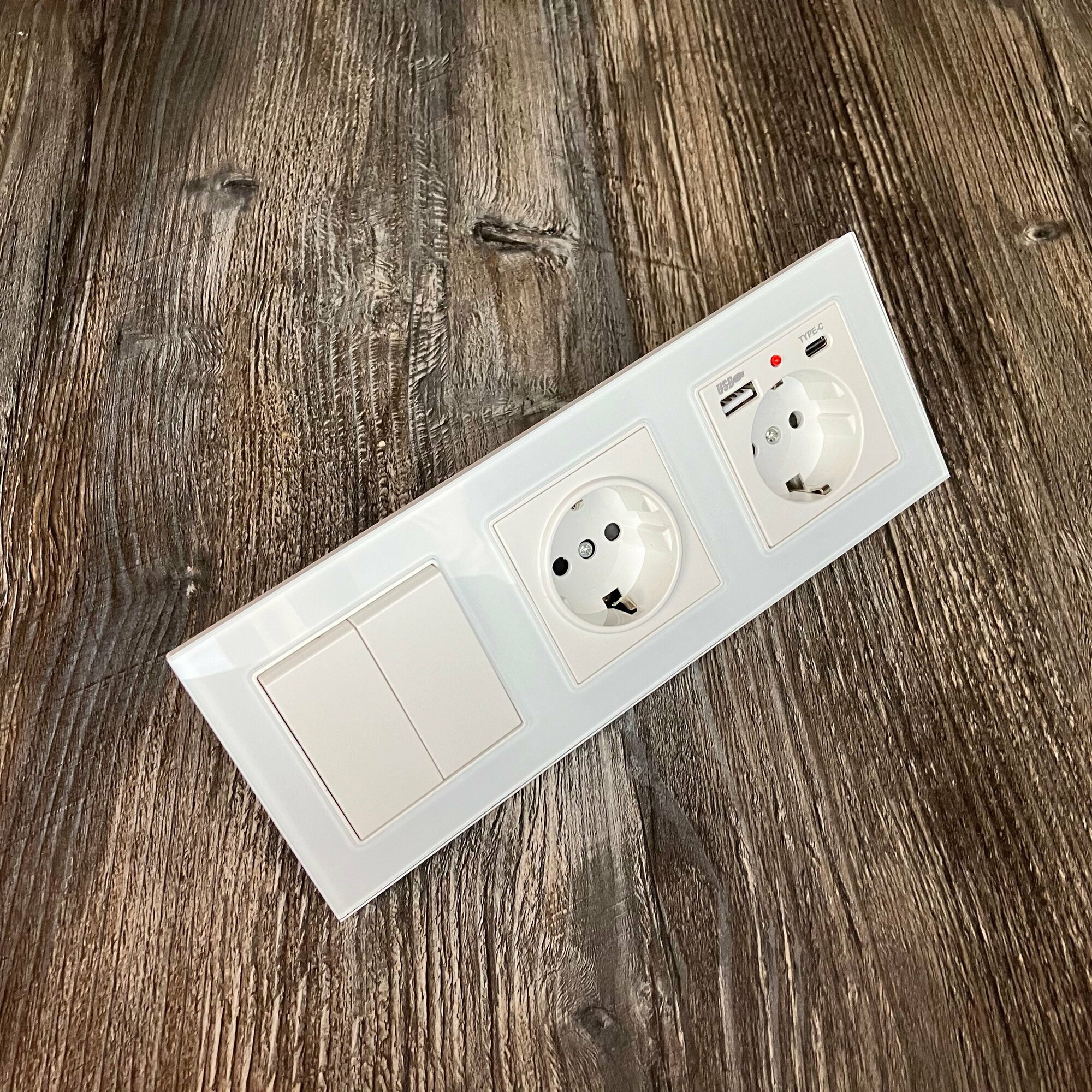 Одноклавишный выключатель с двойной розеткой и 2-мя USB и Type-C, рамка стекло, цвет белый.