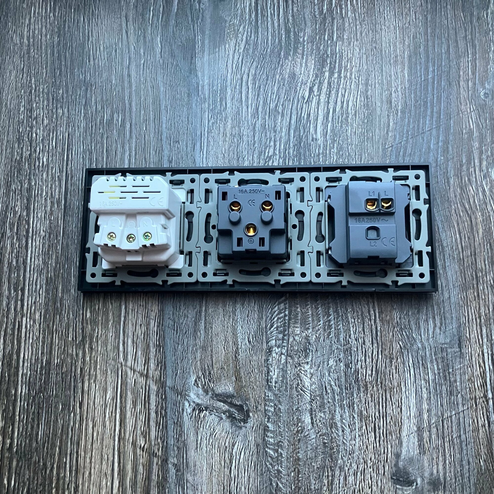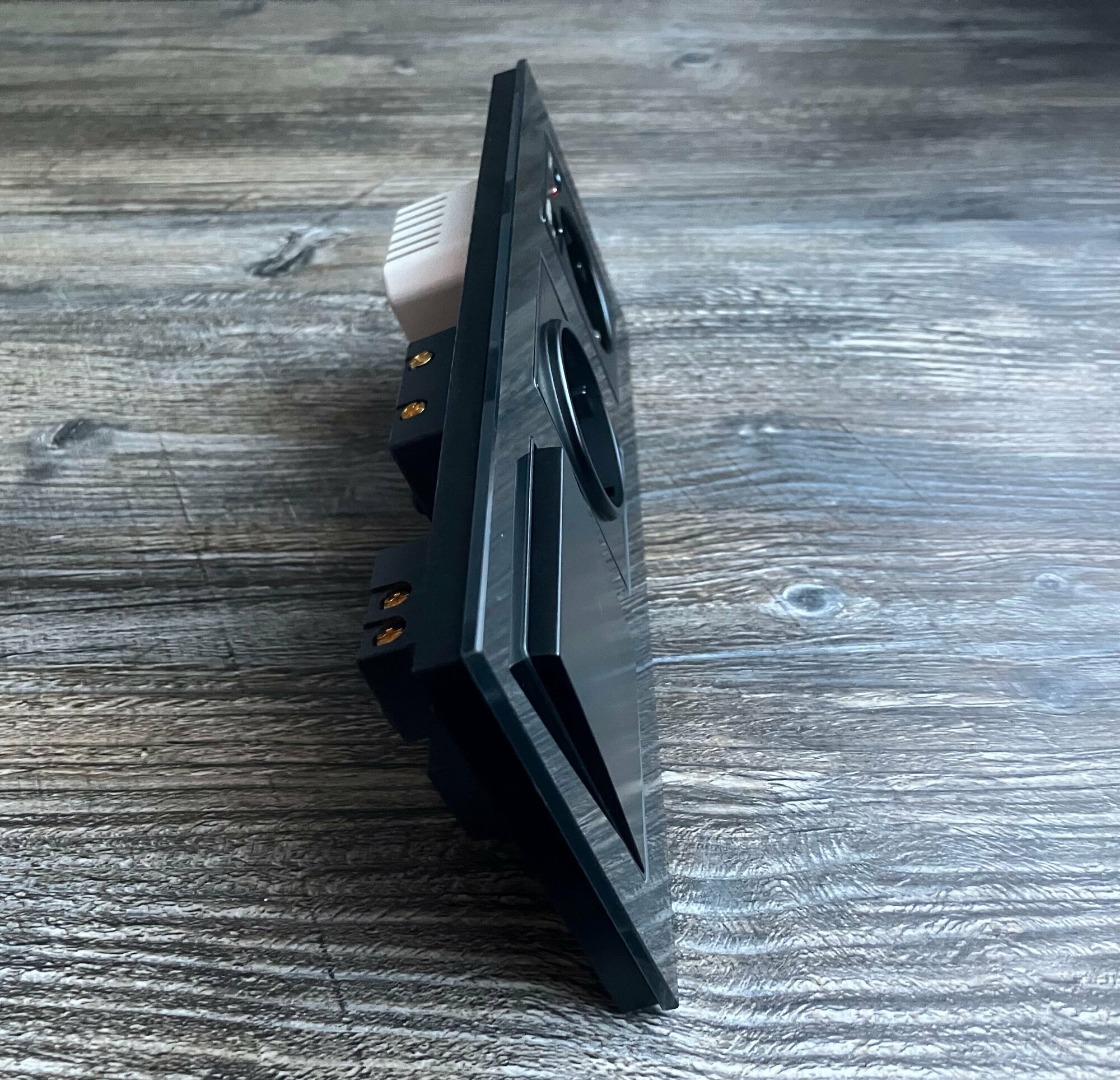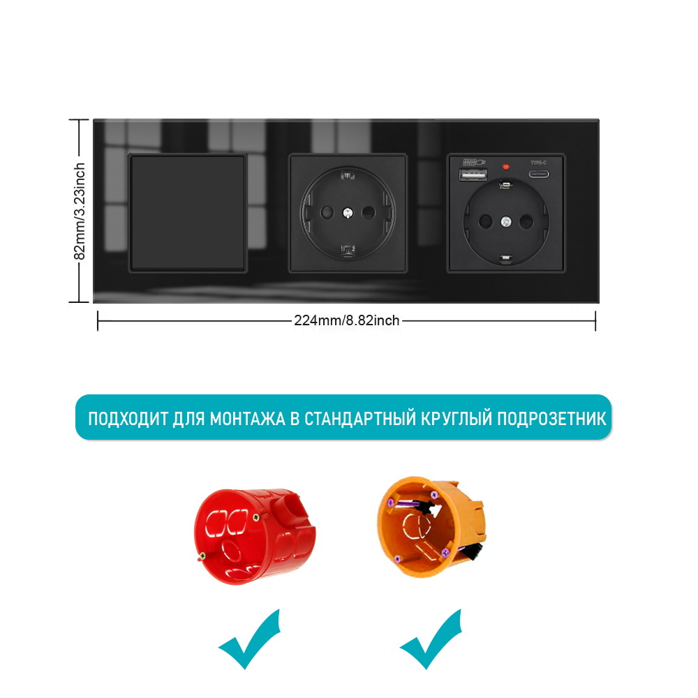 СохранитьОдноклавишный выключатель с двойной розеткой и 2-мя USB и Type-C, рамка стекло, цвет чёрный. интересное: