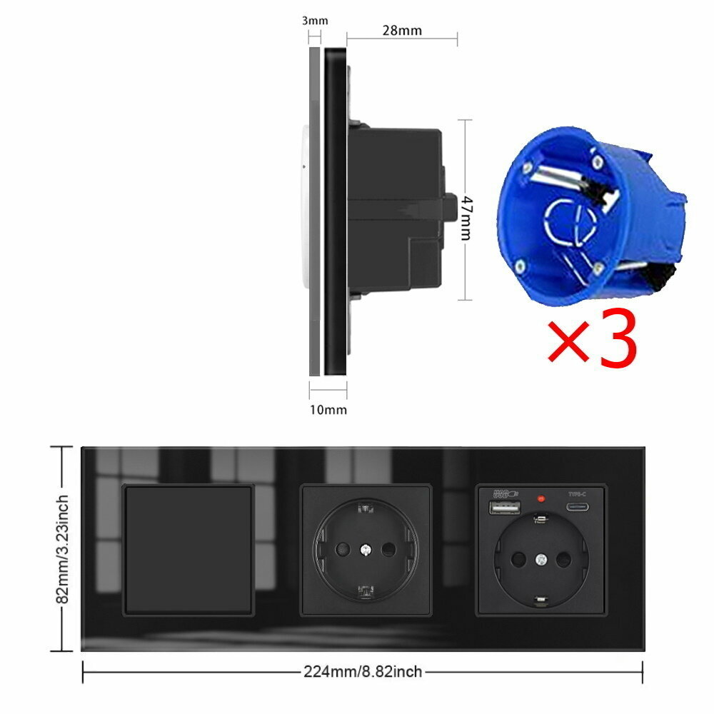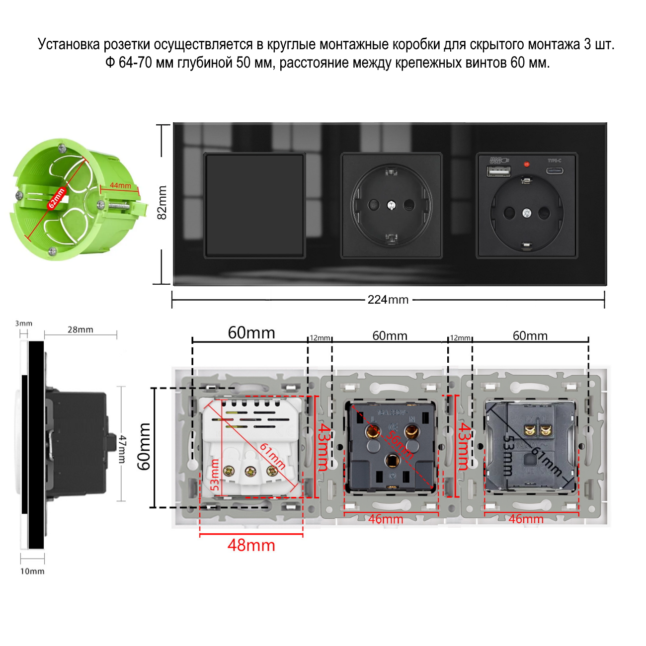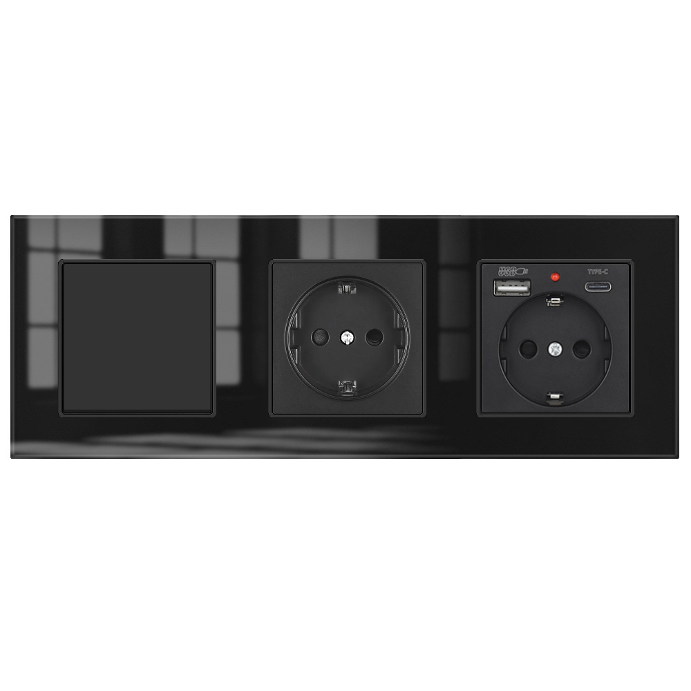 Купить Одноклавишный выключатель с двойной розеткой и 2-мя USB и Type-C, рамка стекло, цвет чёрный.