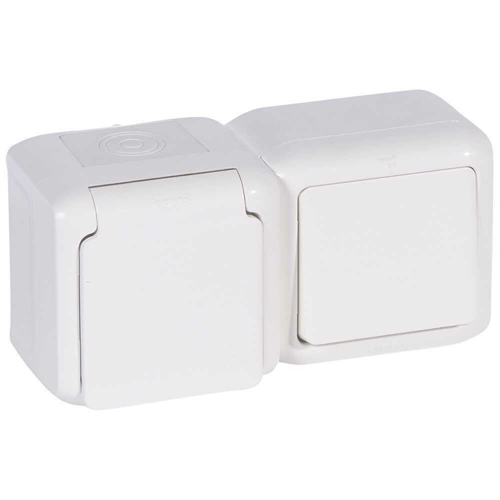 Купить Блок выключатель одноклавишный и розетка 2К+З Legrand Quteo 16A 250V с/з со шторками крышкой IP44 белый 782318