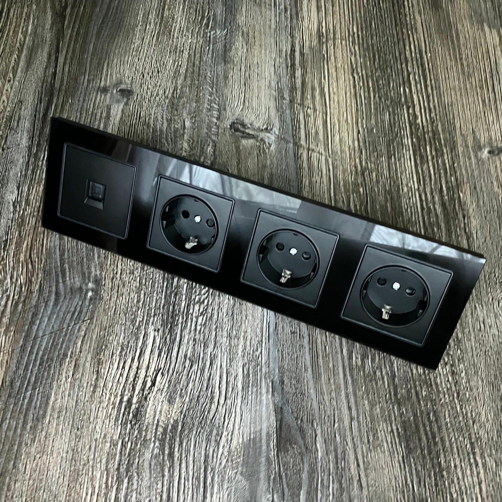 Розетка тройная с интернетом RJ-45 CAT6, 3 поста, рамка стекло, 224х82х8 мм, цвет чёрный