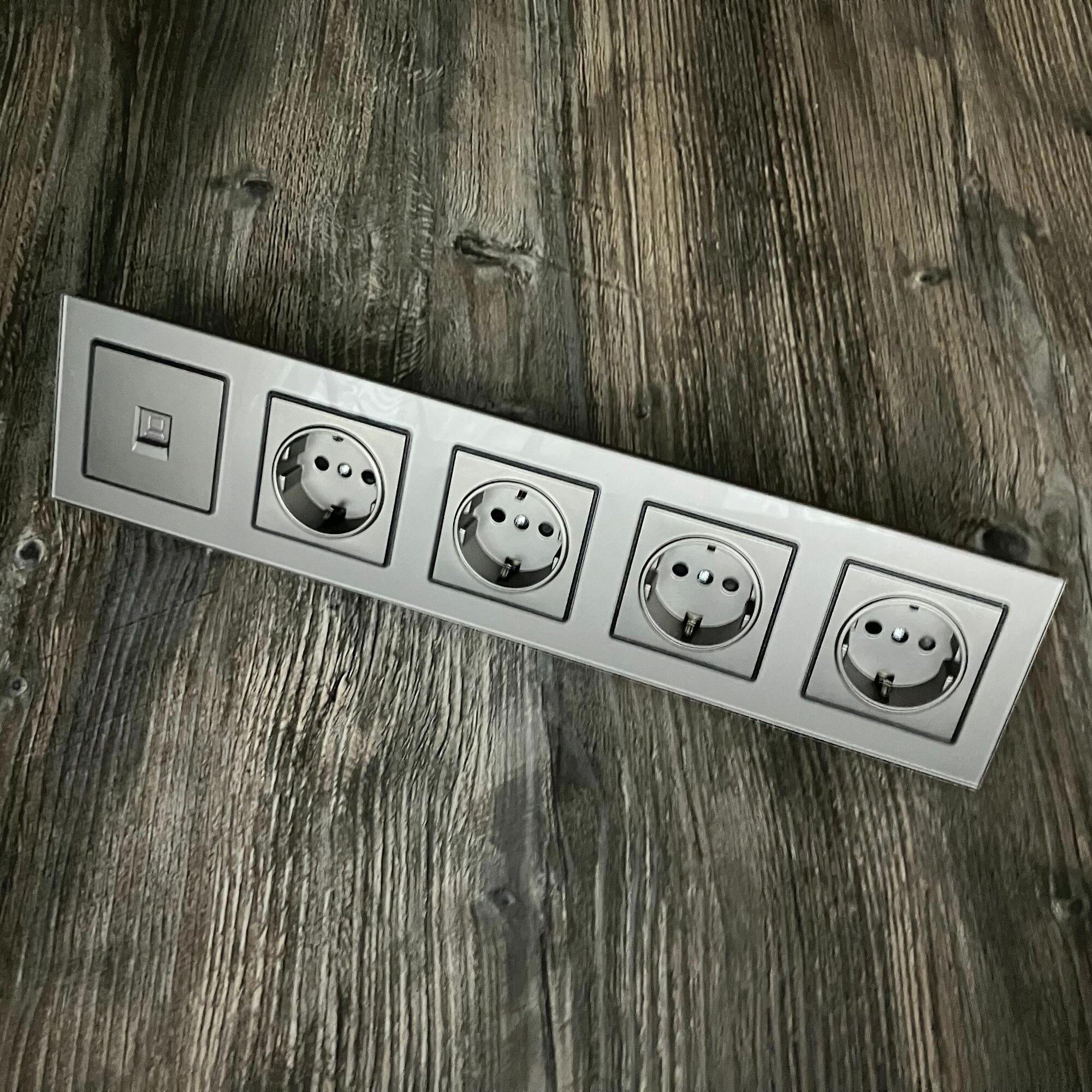 Розетка четырехпостовая с интернетом RJ-45 CAT6, 4 поста, рамка стекло, 295х82х8 мм, цвет серый