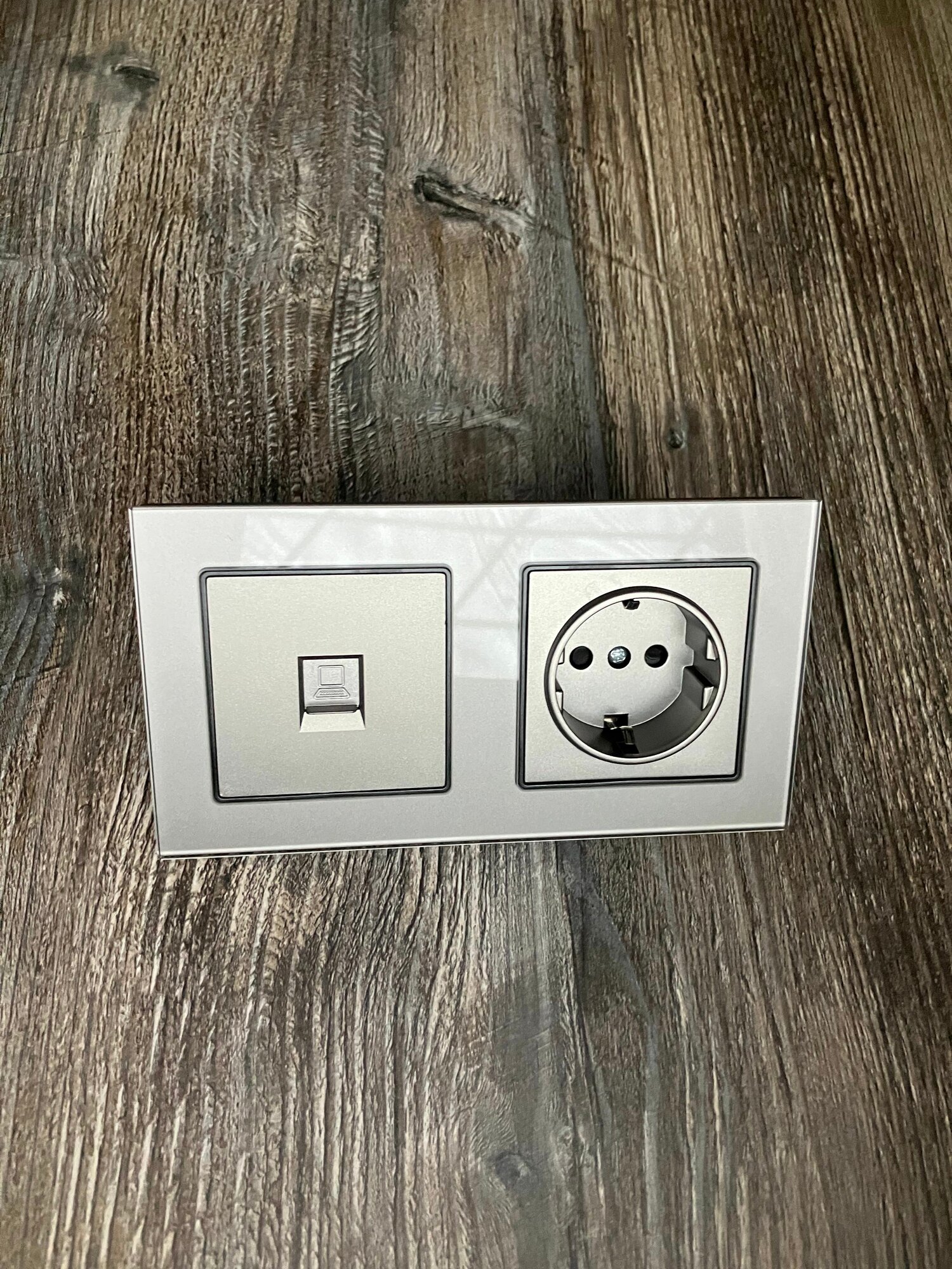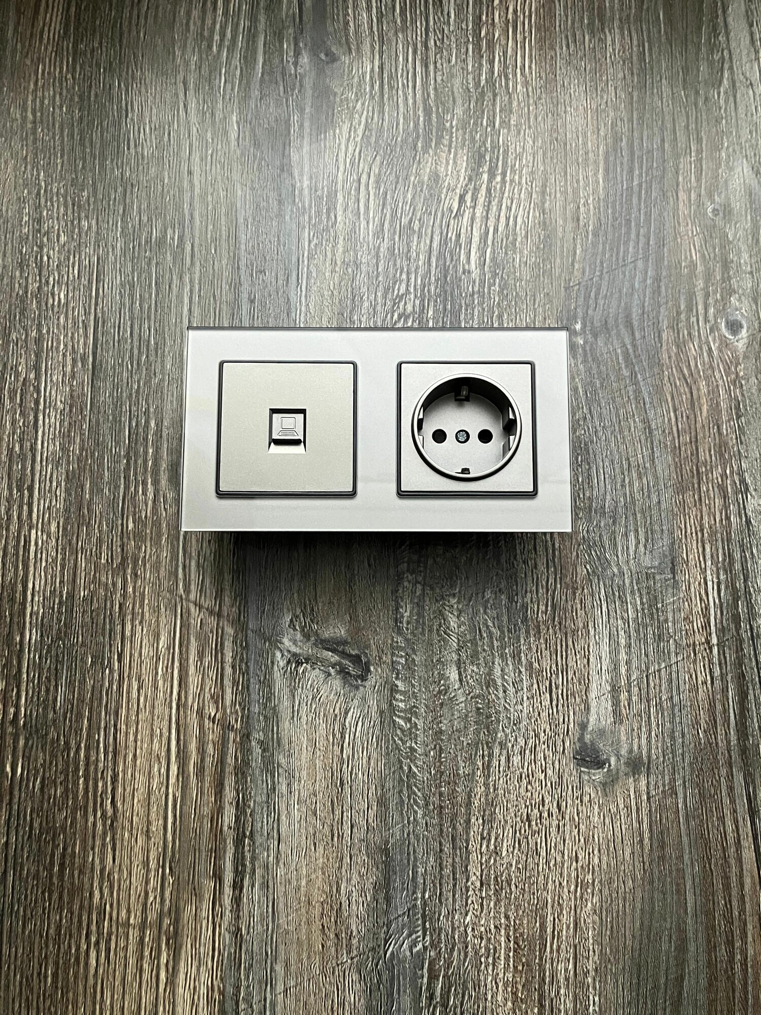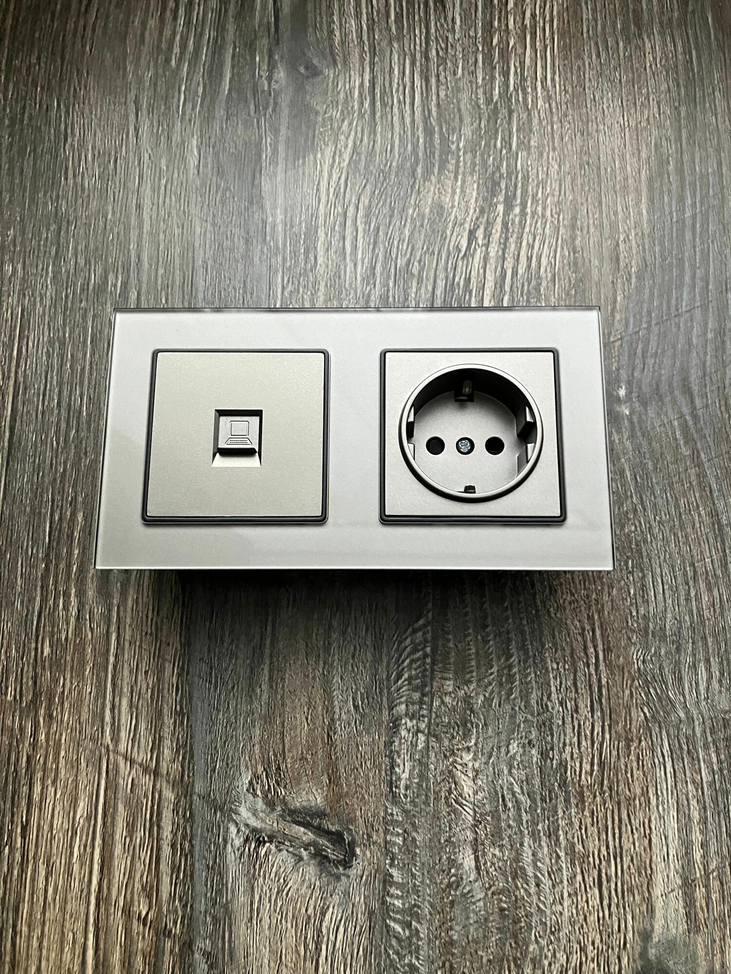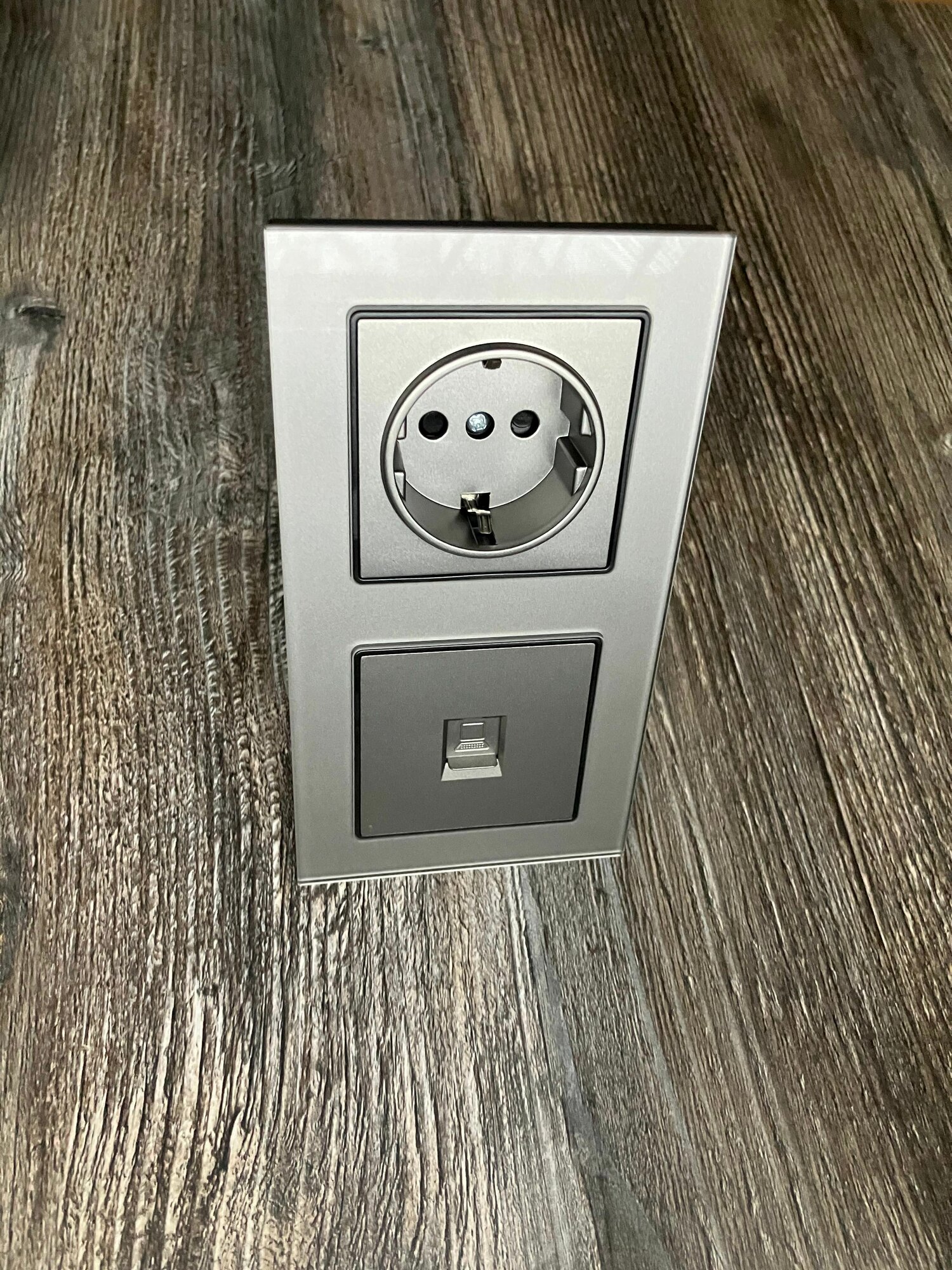 Розетка четырехпостовая с интернетом RJ-45 CAT6, 4 поста, рамка стекло, 295х82х8 мм, цвет серый