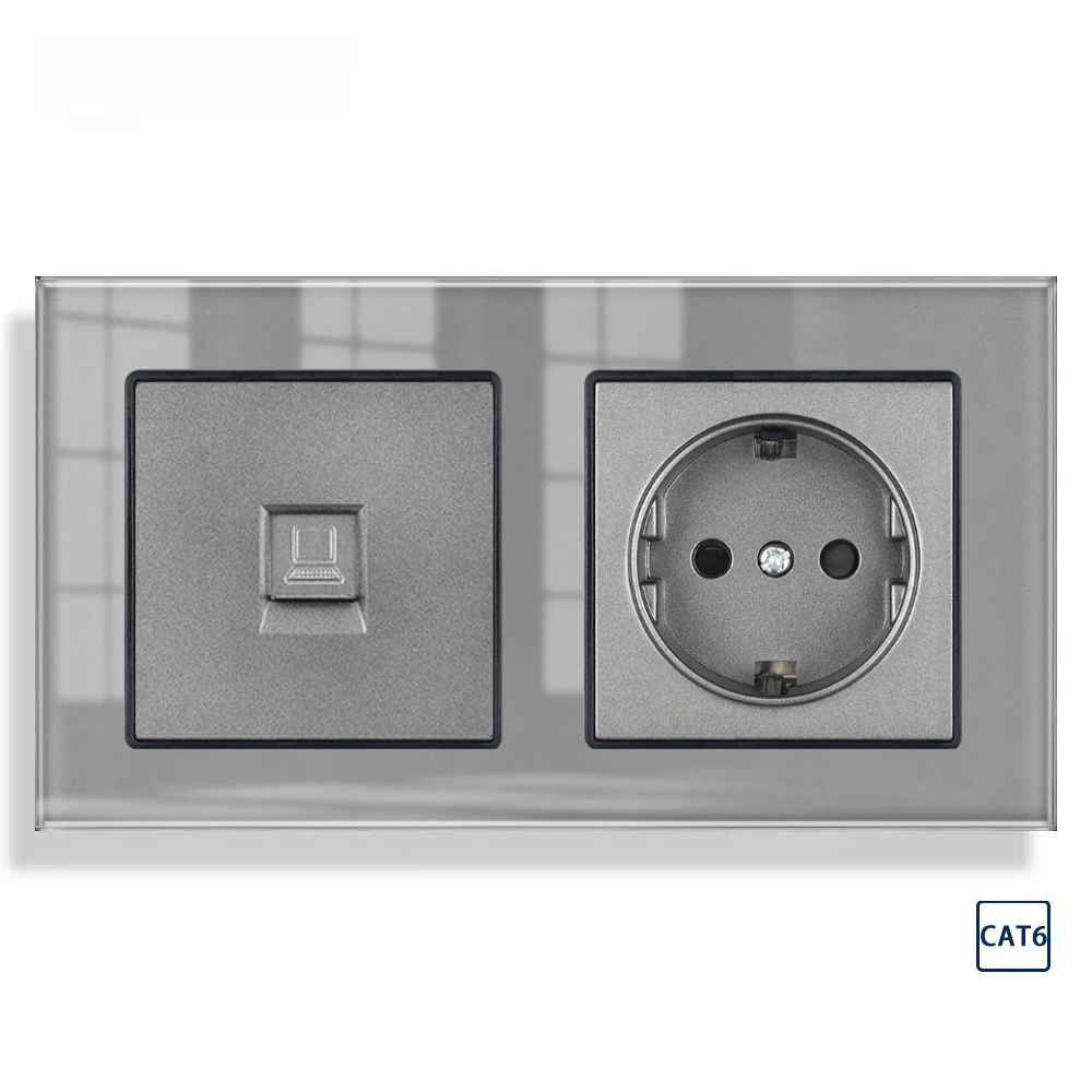Купить Розетка двойная с интернетом RJ-45 CAT6, 2 поста, рамка стекло, 153*82*8 мм, цвет серый