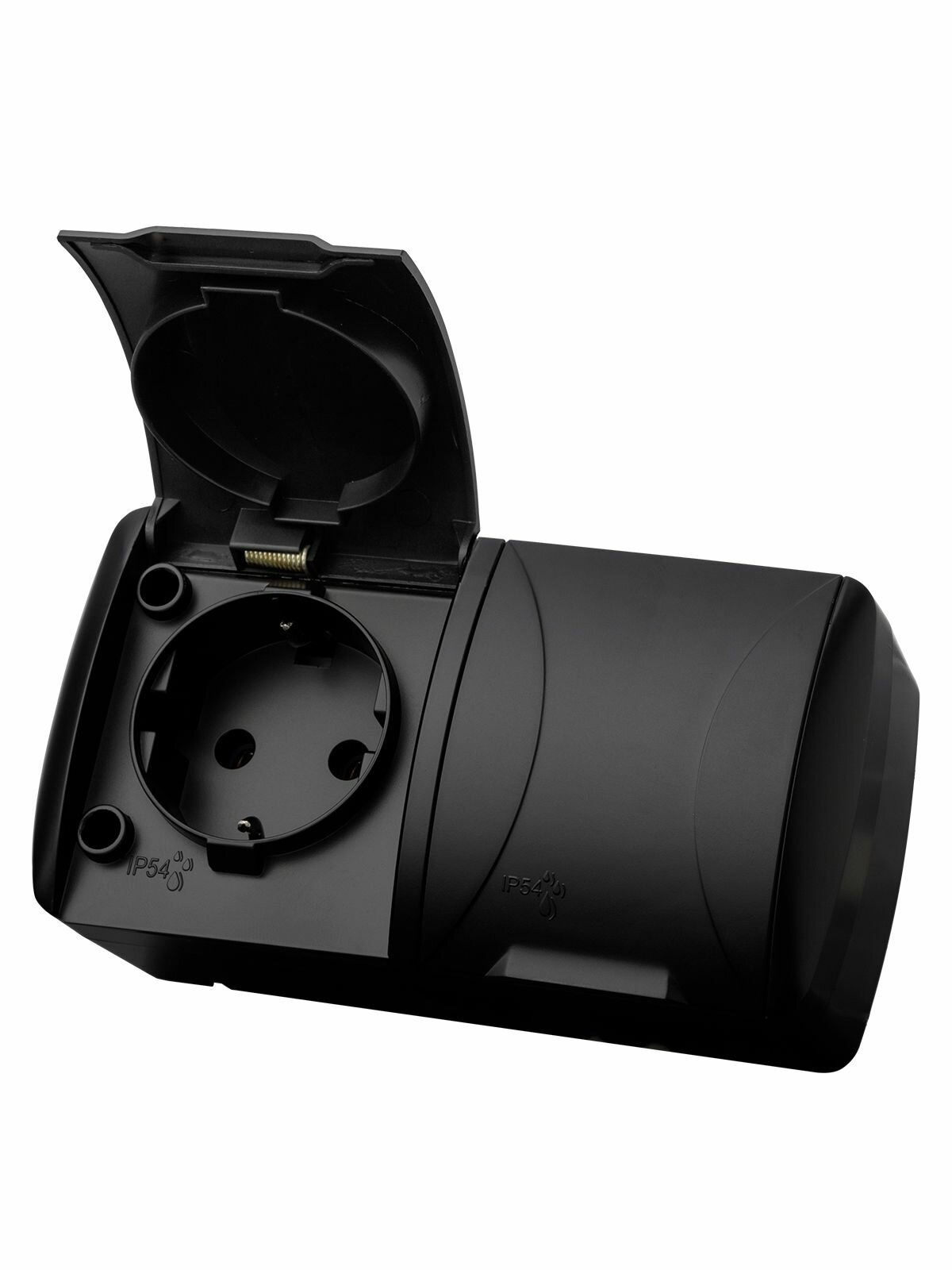 Купить Розетка двойная открытой установки с заземлением с крышкой графит 2П, 16А, IP54, Селигер