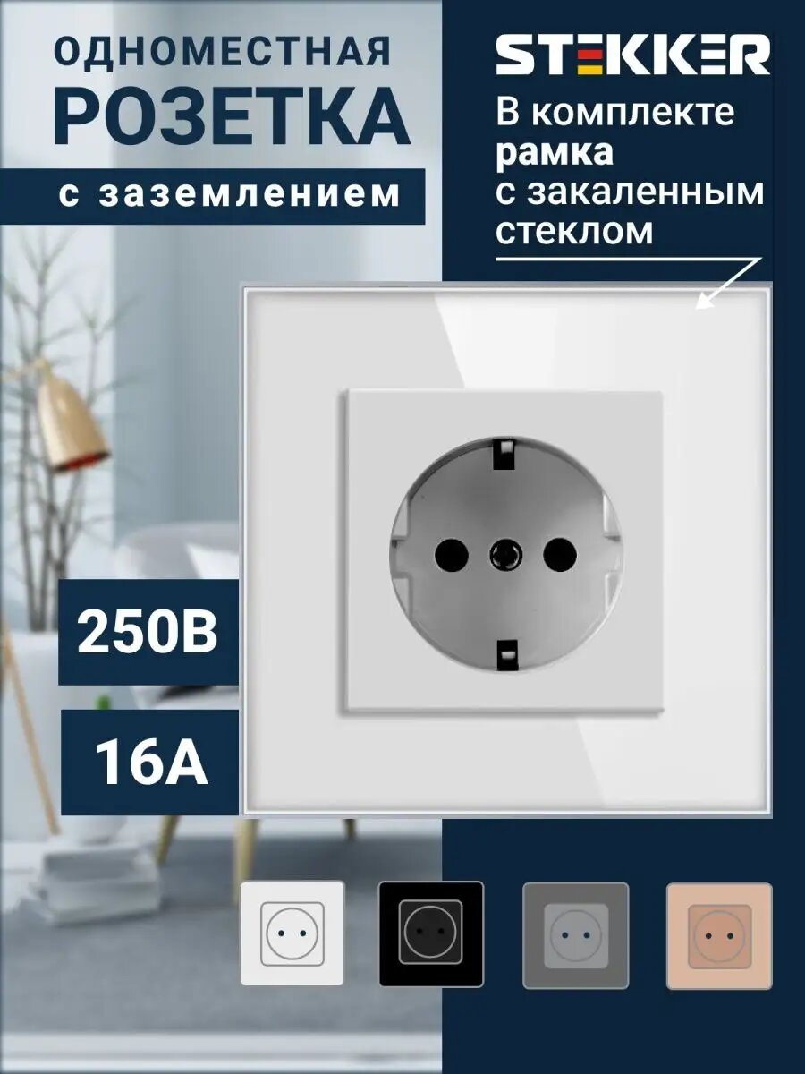 Купить Розетка Stekker "Катрин", одинарная, белая, с заземлением и шторками, стекло