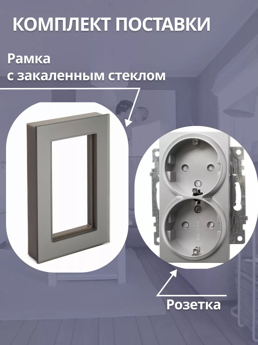 Розетка Stekker "Катрин", двойная, серая, без заземления, со шторками, стекло
