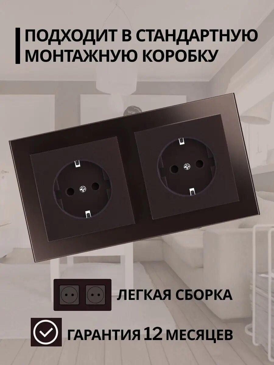 Розетка Stekker "Катрин", двойная, черная, с заземлением и шторками, стекло