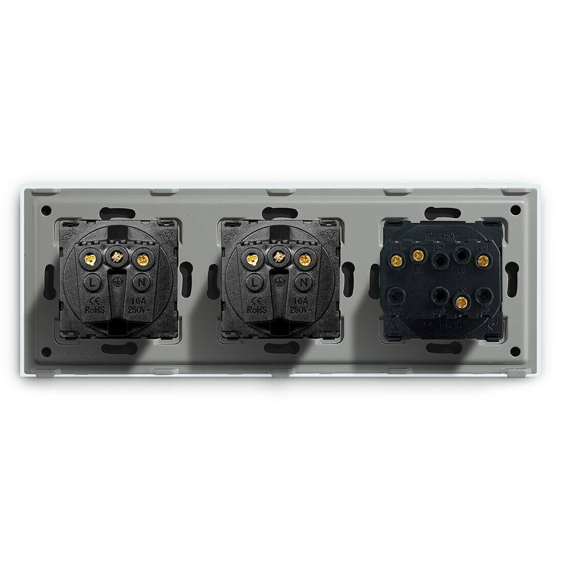 Выключатель с розеткой, 3 клавиши 2 розетки, 3 поста (M3+2F) рамка пластик 228х86мм цвет серый