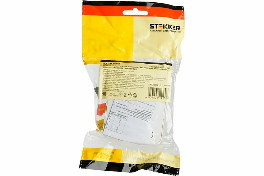 Выключатель одноклавишный с подсветкой открытой установки STEKKER, серия софия, белый, IP20
