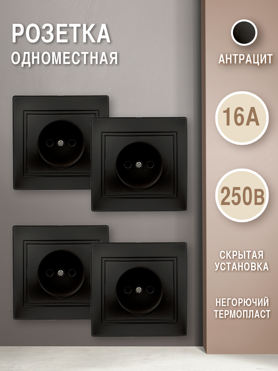 Купить Розетка (комплект 4 шт.) без заземления 2P, 16А-250В, IP20, СУ, антрацит