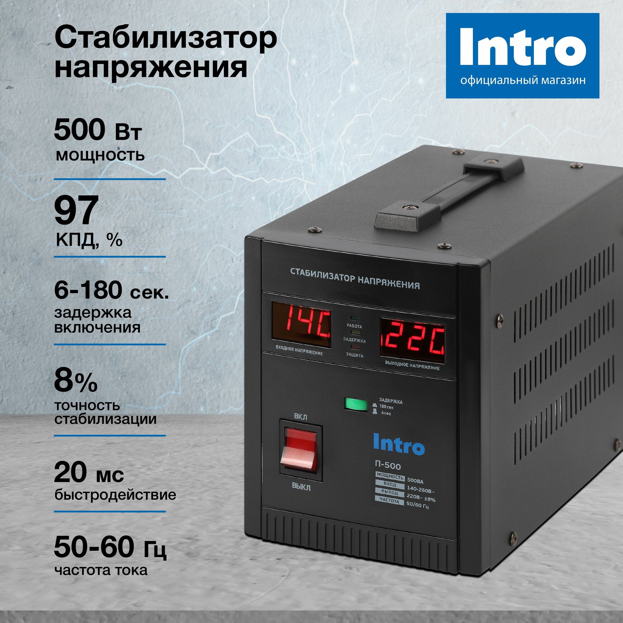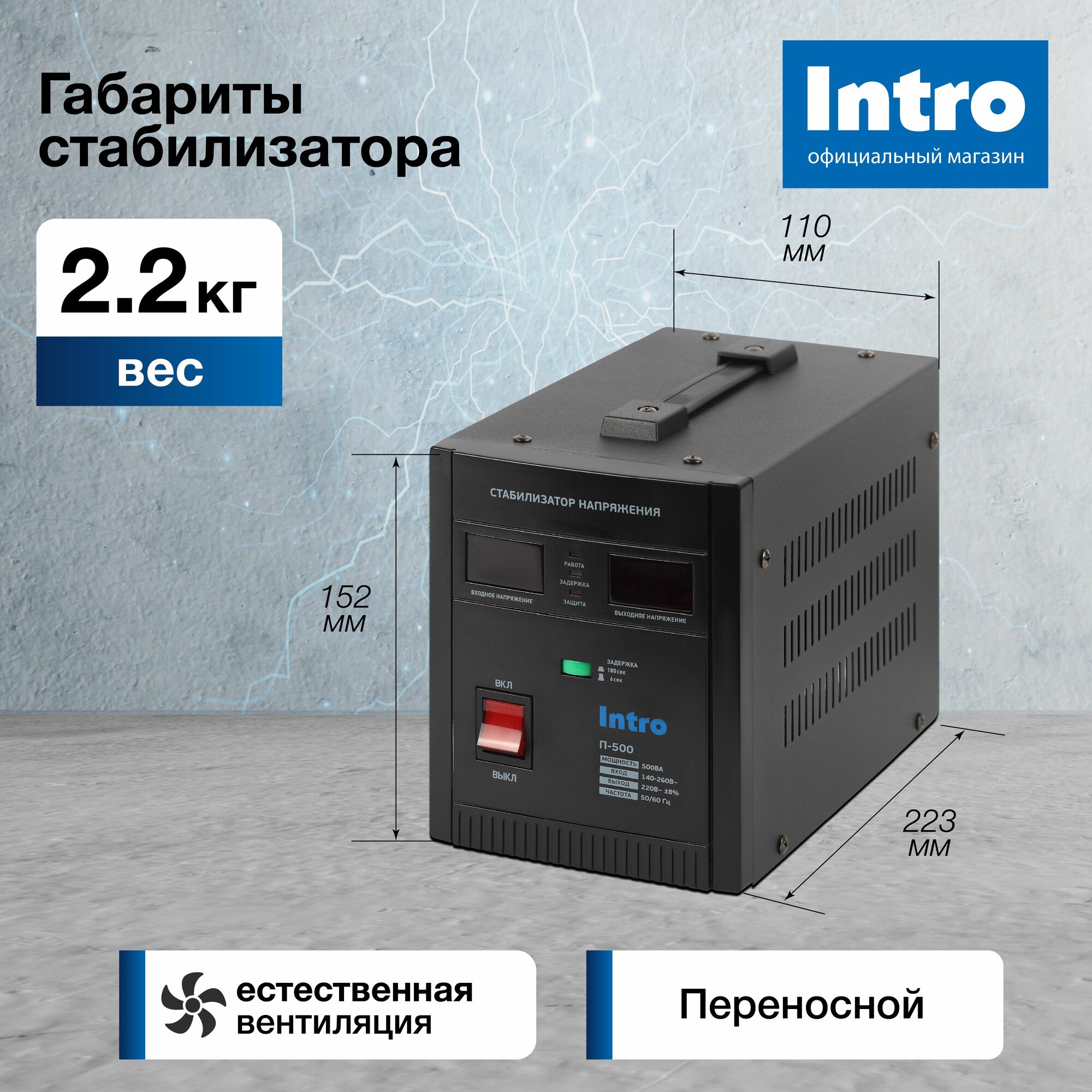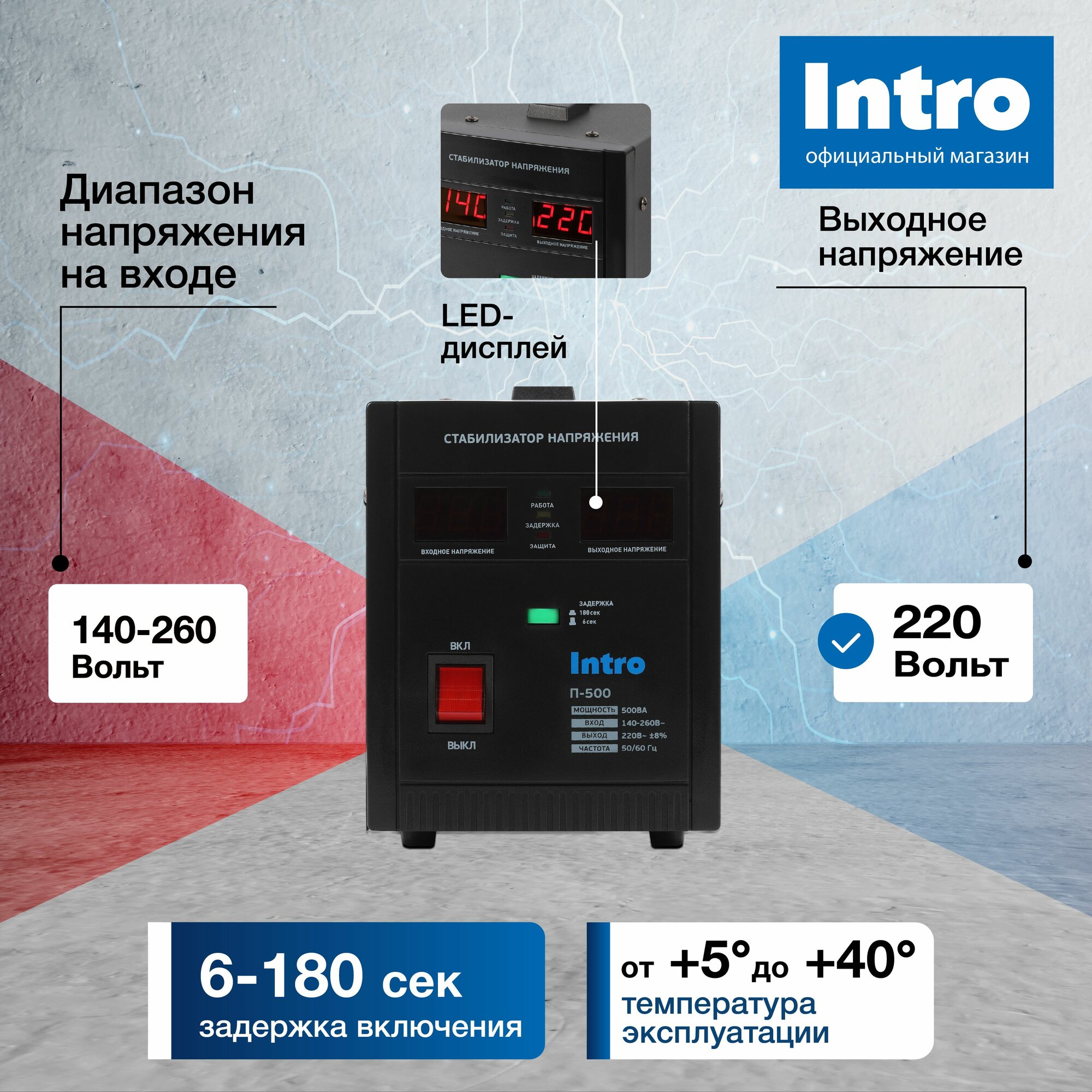 Стабилизатор напряжения 220в Intro П-500 однофазный релейный переносной напольный для газового котла 500ВА, 140-260В интересное: