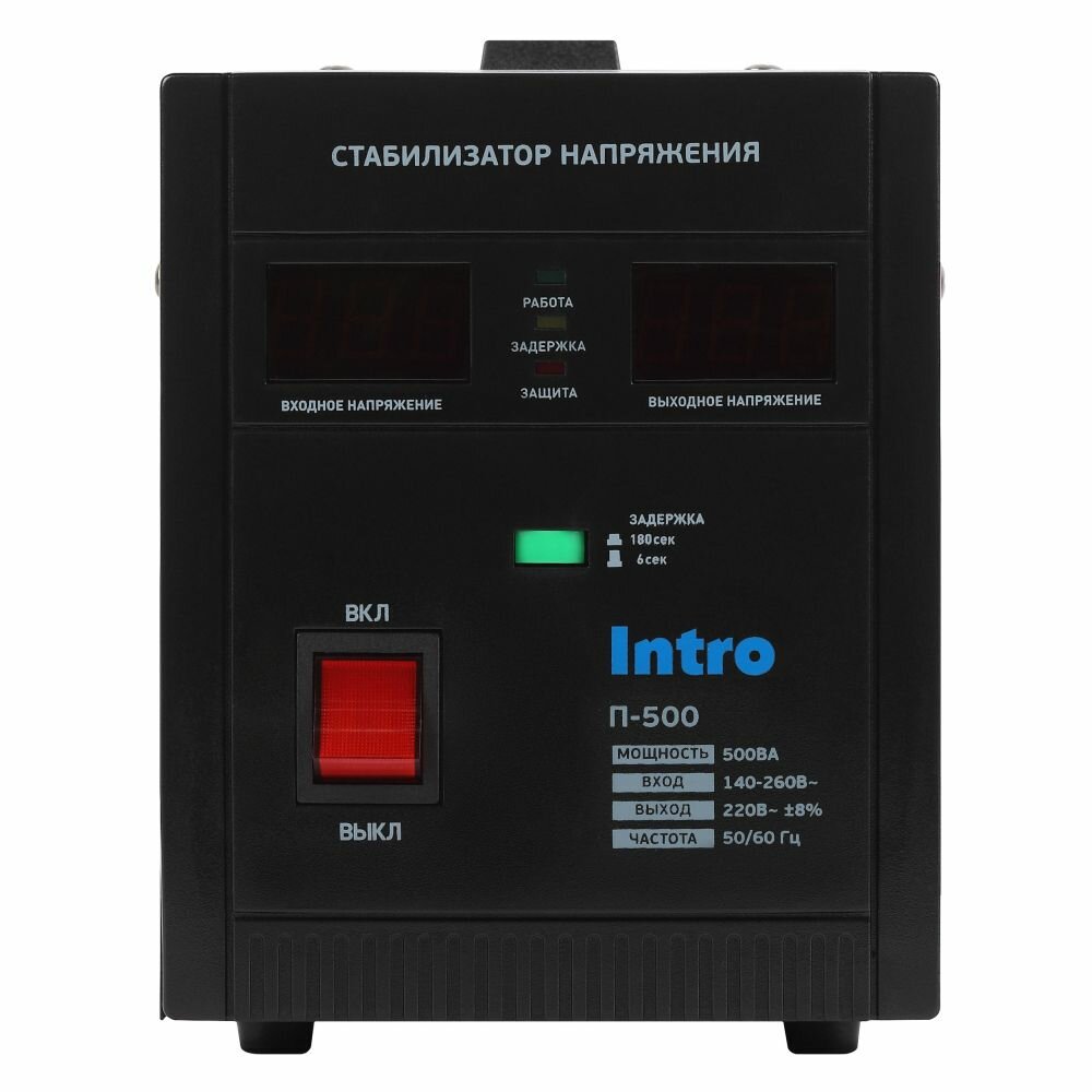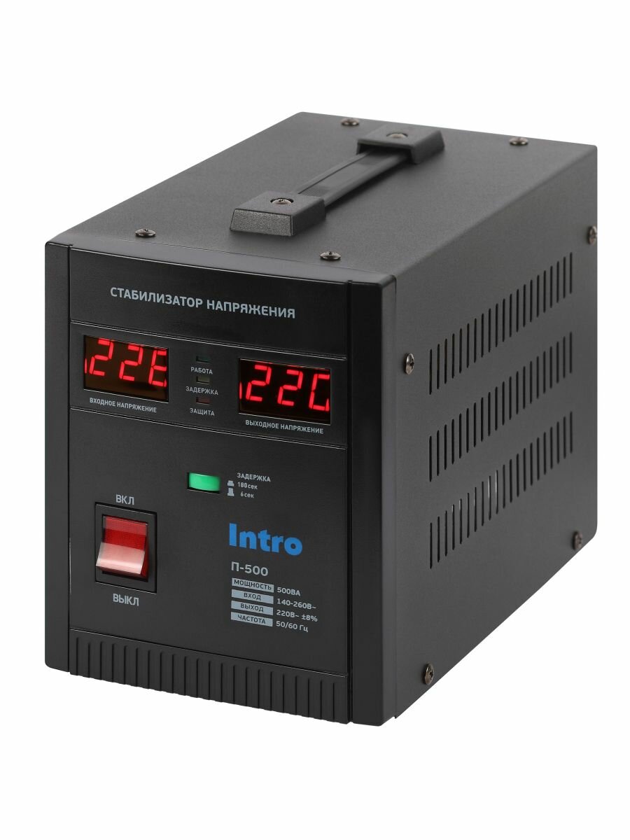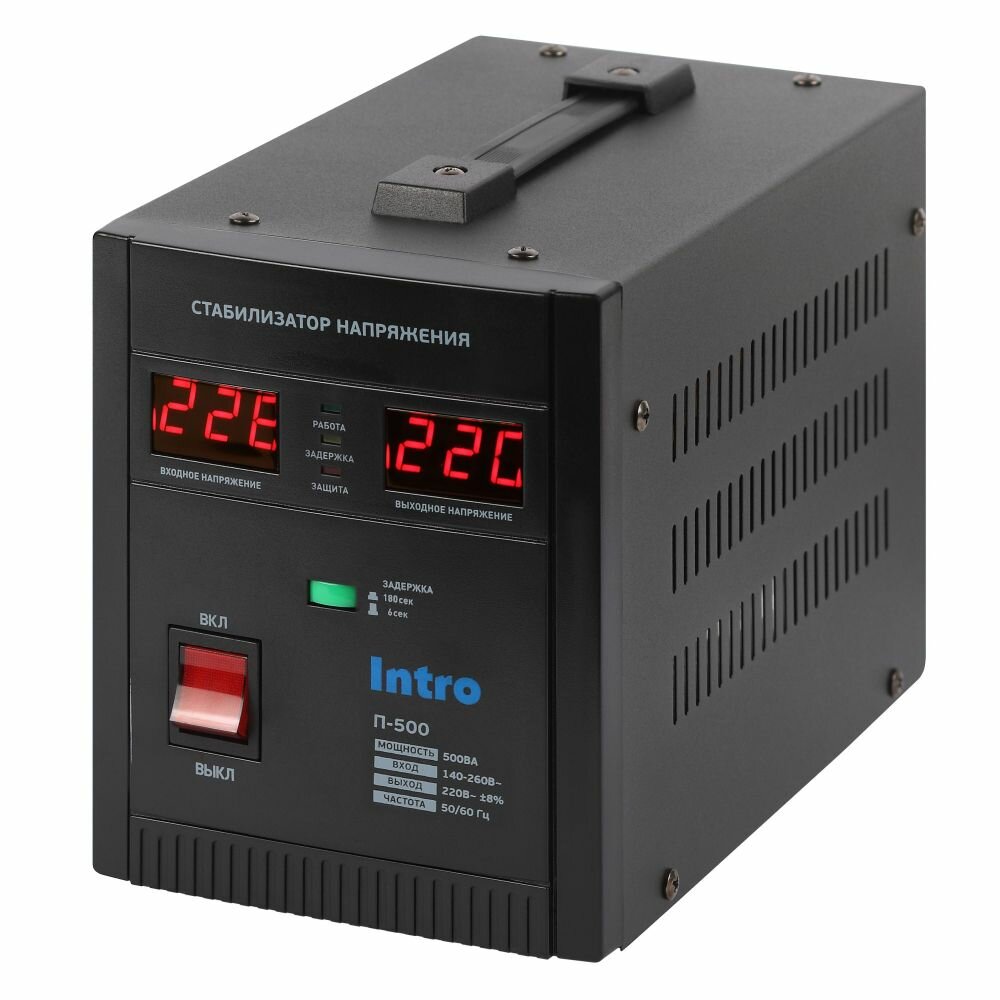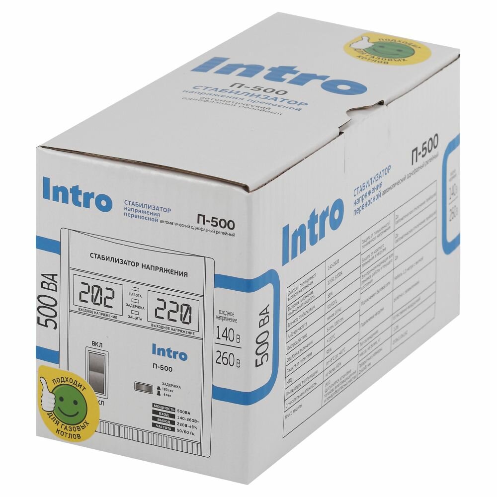Купить Стабилизатор напряжения 220в Intro П-500 однофазный релейный переносной напольный для газового котла 500ВА, 140-260В