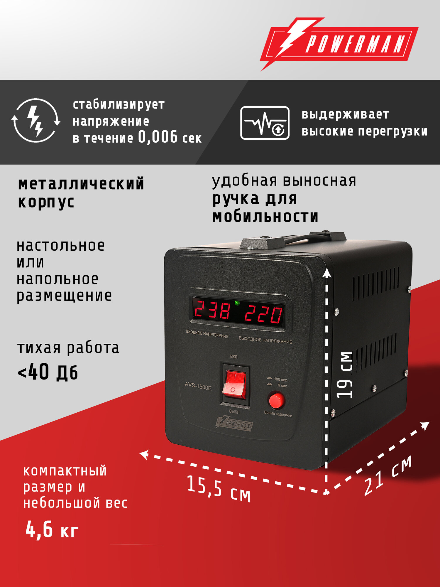 Стабилизатор напряжения однофазный AVS 1500 E Black, Powerman