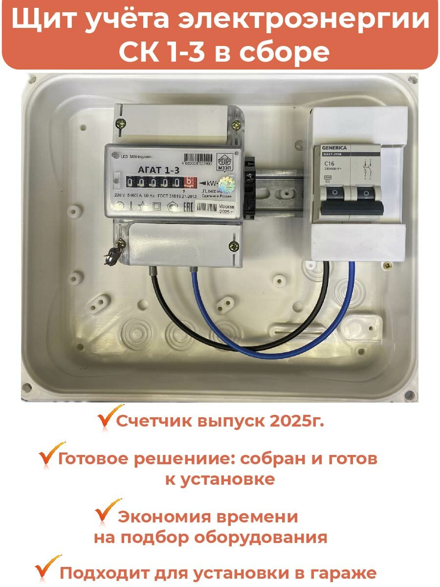 Комплект Гаражный-1А-16: Щит учёта электроэнергии в сборе СК 1-3: счетчик Агат 1-3, автомат C16 интересное: