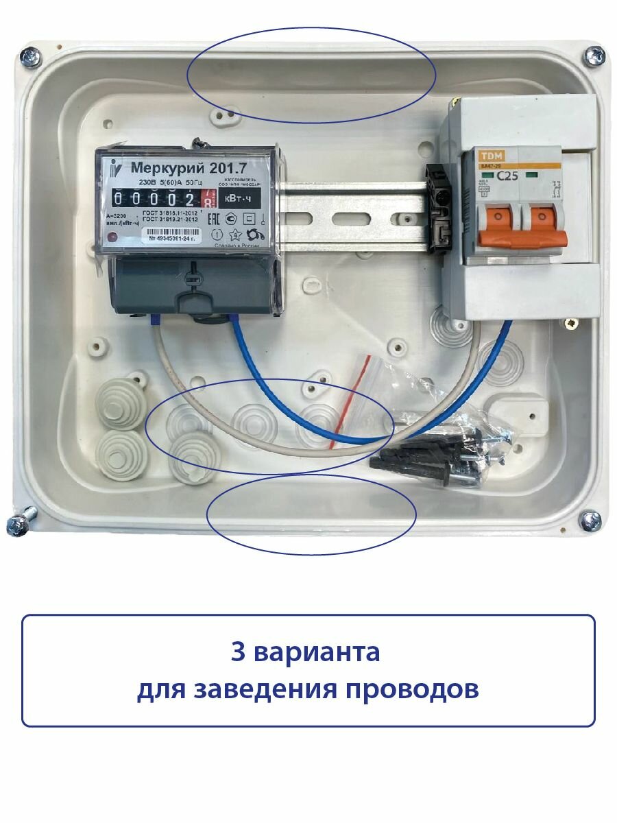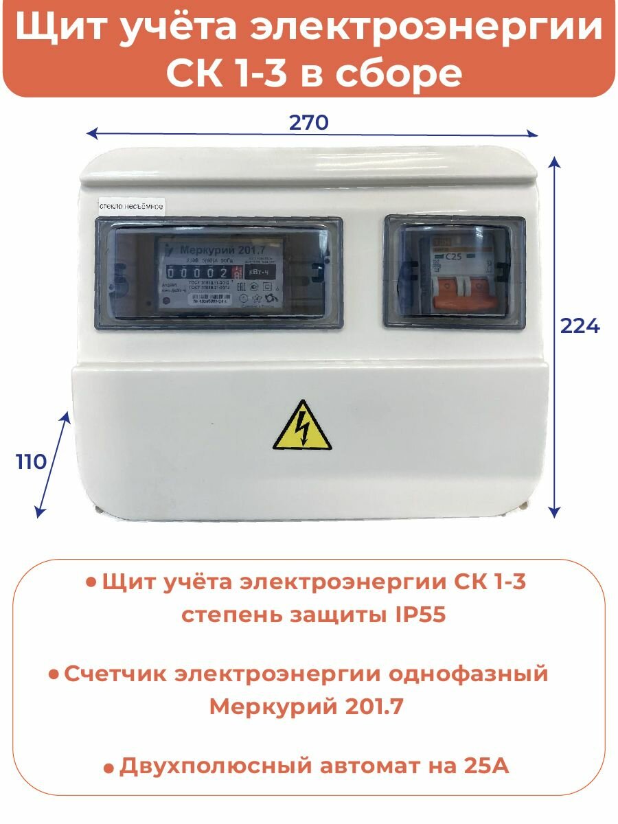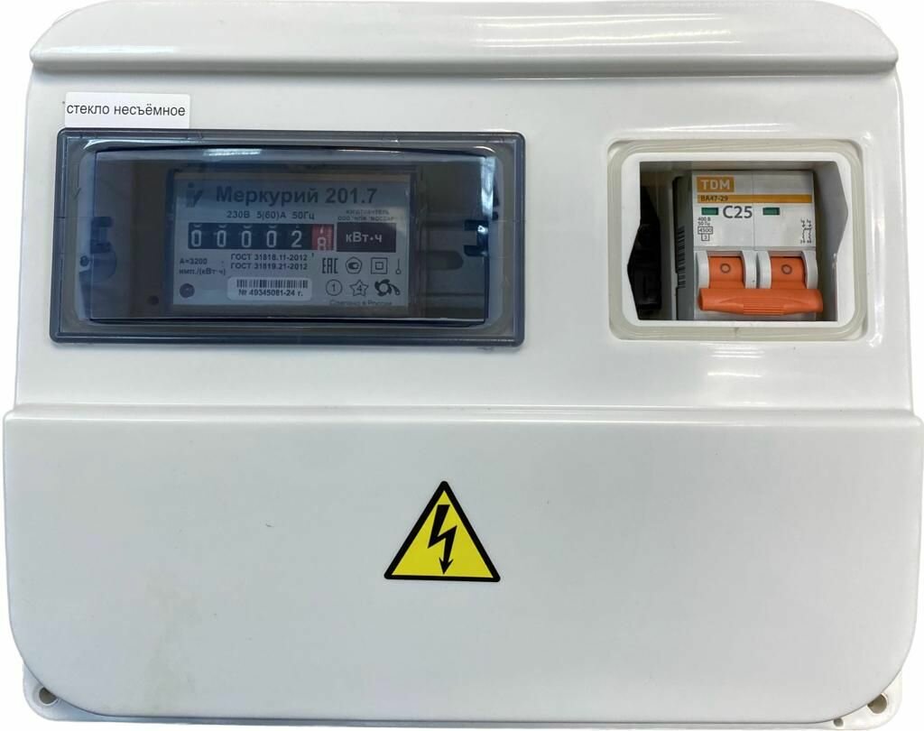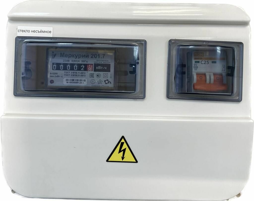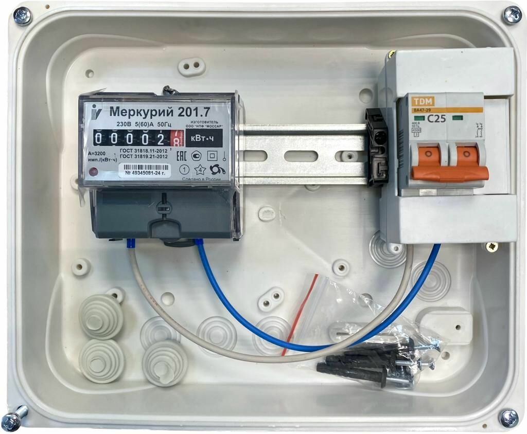 Комплект Гаражный-1М-25: Щит учёта электроэнергии в сборе СК 1-3: счетчик Меркурий 201.7, автомат C25 TDM интересное: