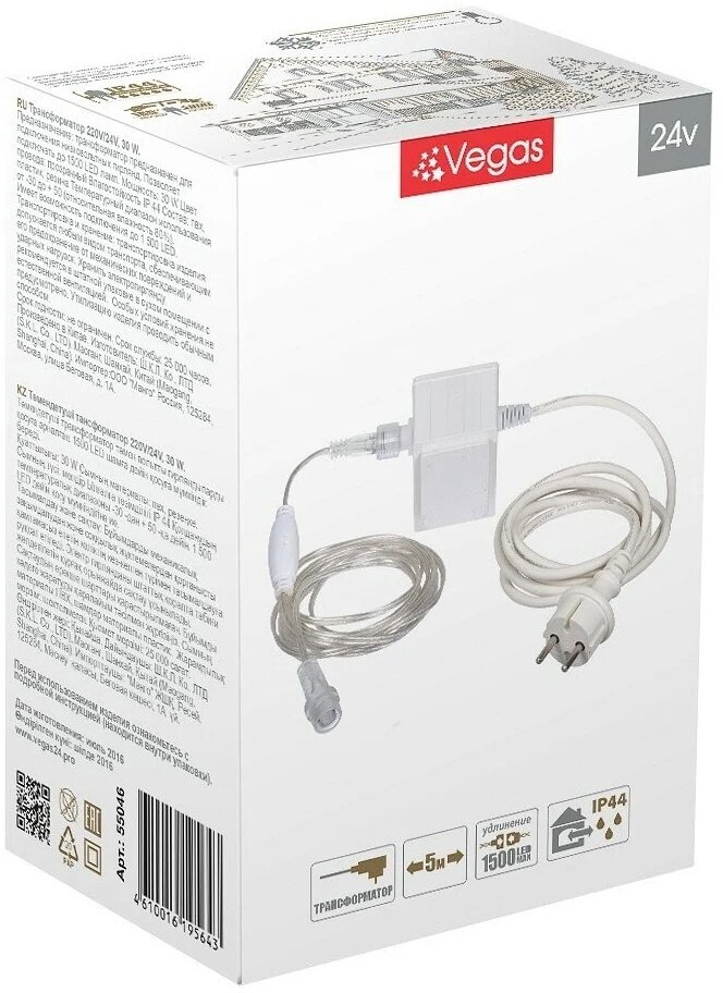 Блок питания (преобразователь), длина 5м(кабель 2м + провод 3м), IP44, max 1500LED, 30W, 220V/24V интересное: