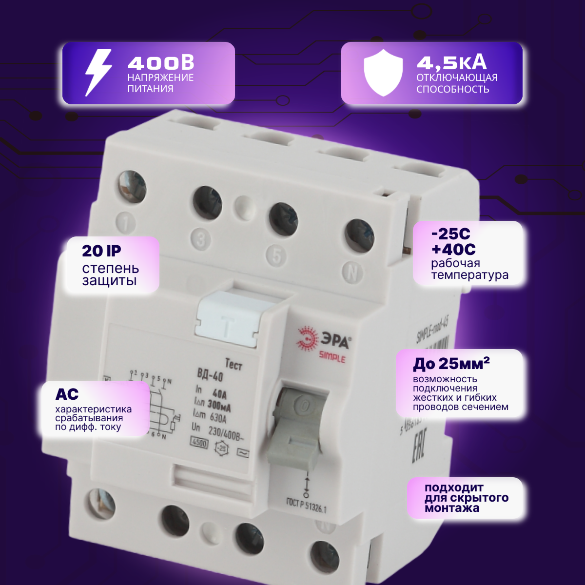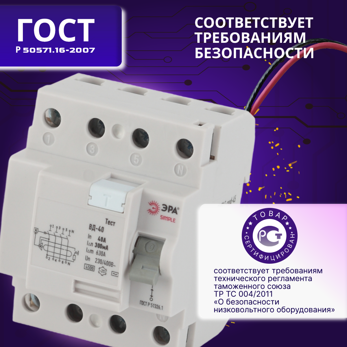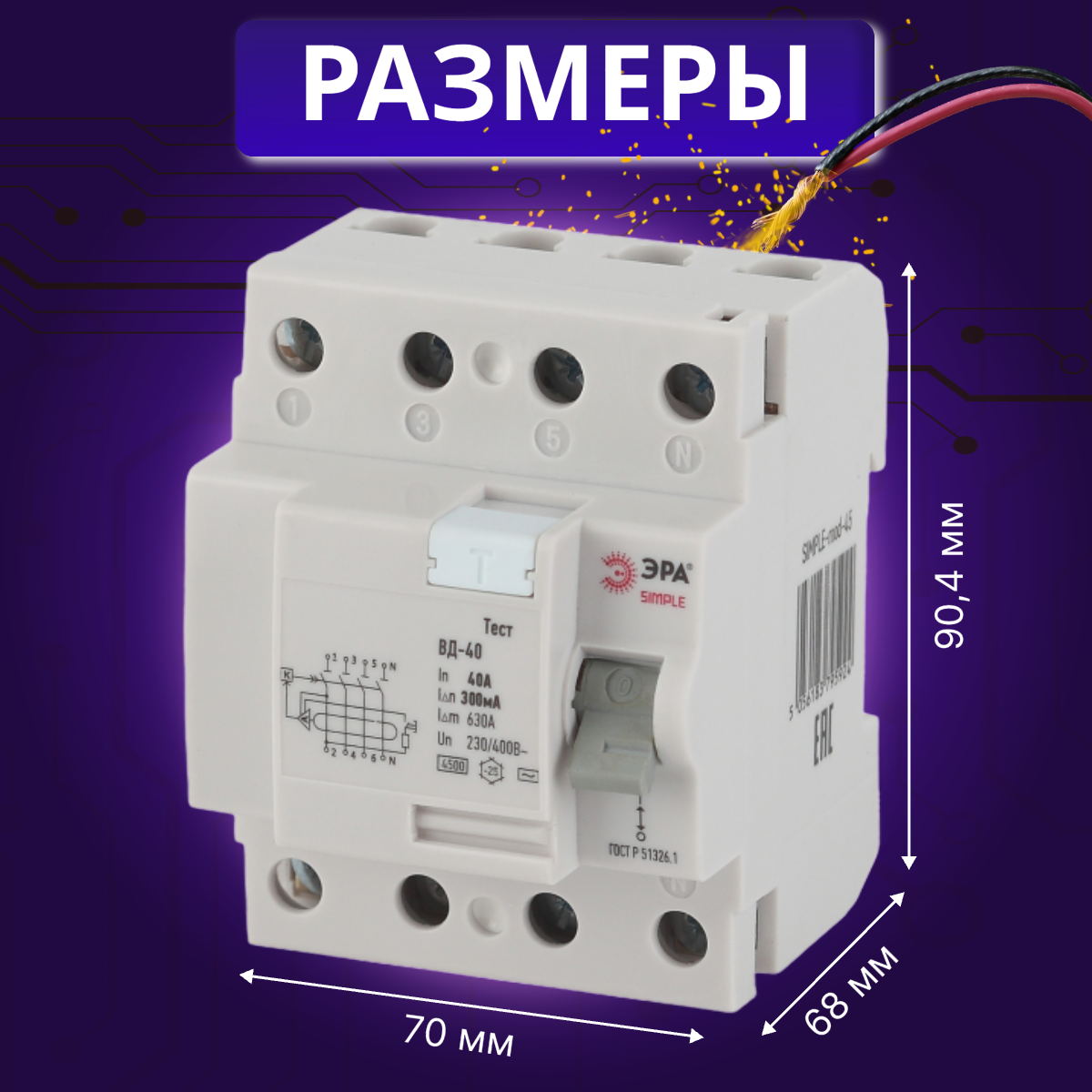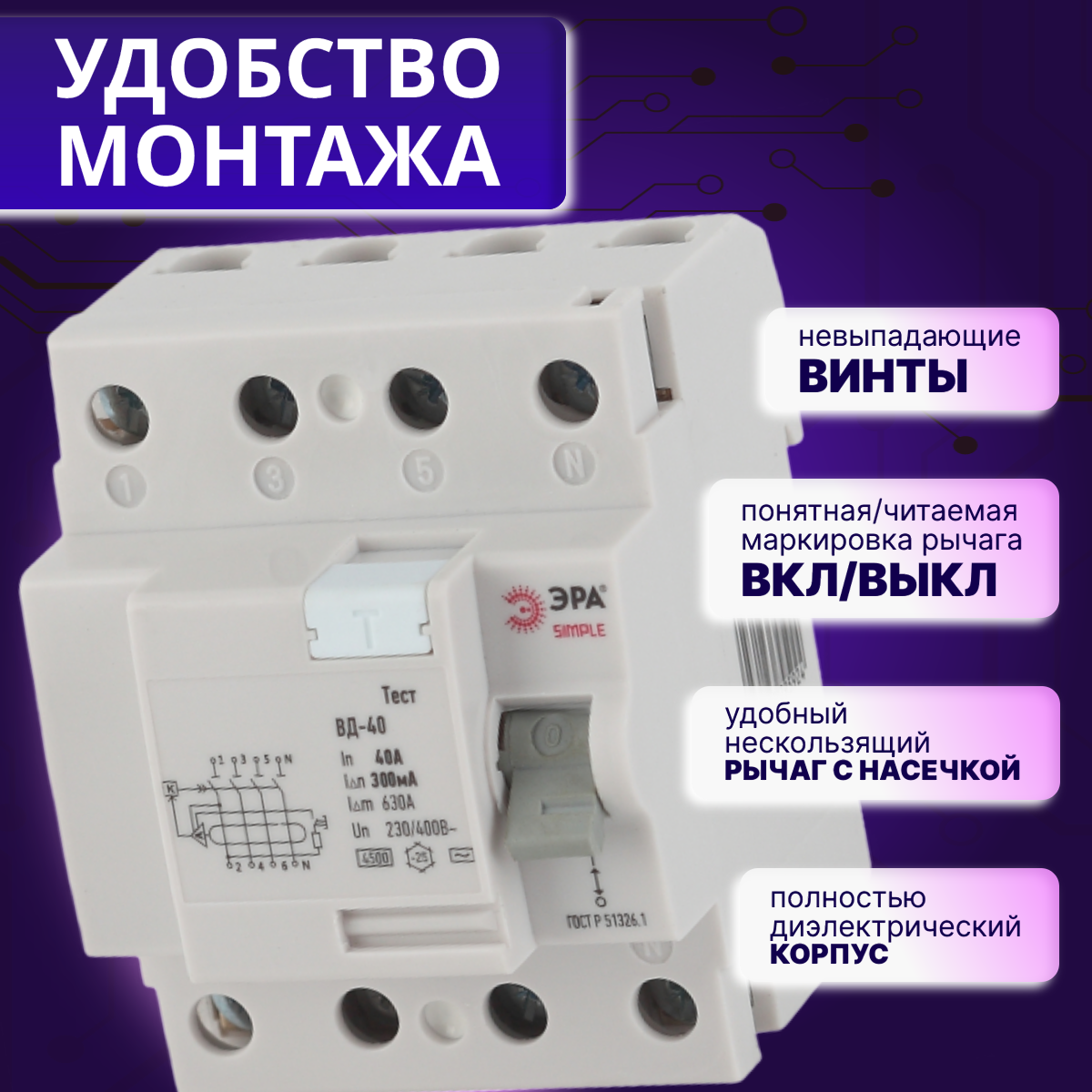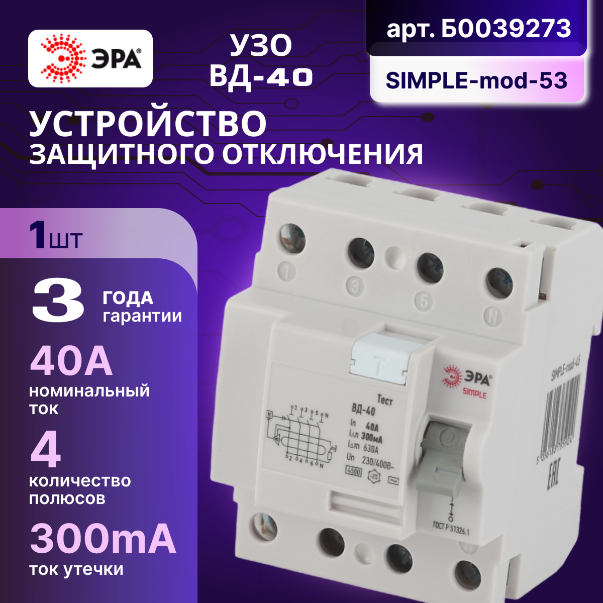 Выключатель диф тока УЗО 4P (4П) 40А 300 мА АС электронное SIMPLE-mod-53 ВД-40 Б0039273 Эра 1шт интересное: