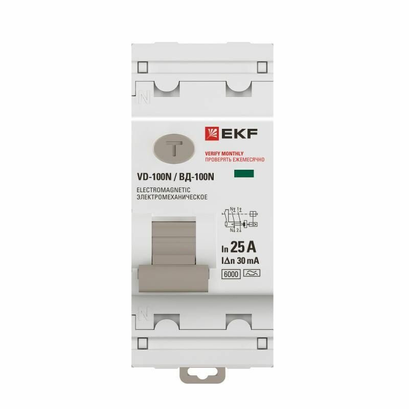 УЗО 25А, ток утечки 100мА, тип A, двухполюсное 2P, 6кА , EKF PROXIMA ВД-100N дифференциальный выключатель - устройство защитного отключения