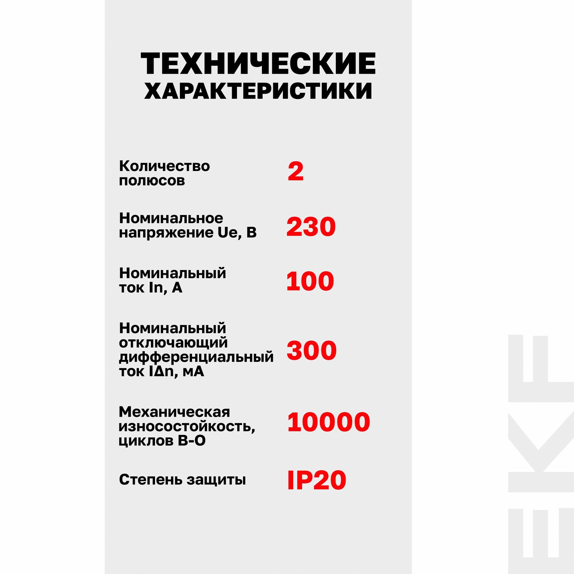УЗО 80А, ток утечки 300мА, тип A, двухполюсное 2P, 6кА , EKF PROXIMA ВД-100N дифференциальный выключатель - устройство защитного отключения