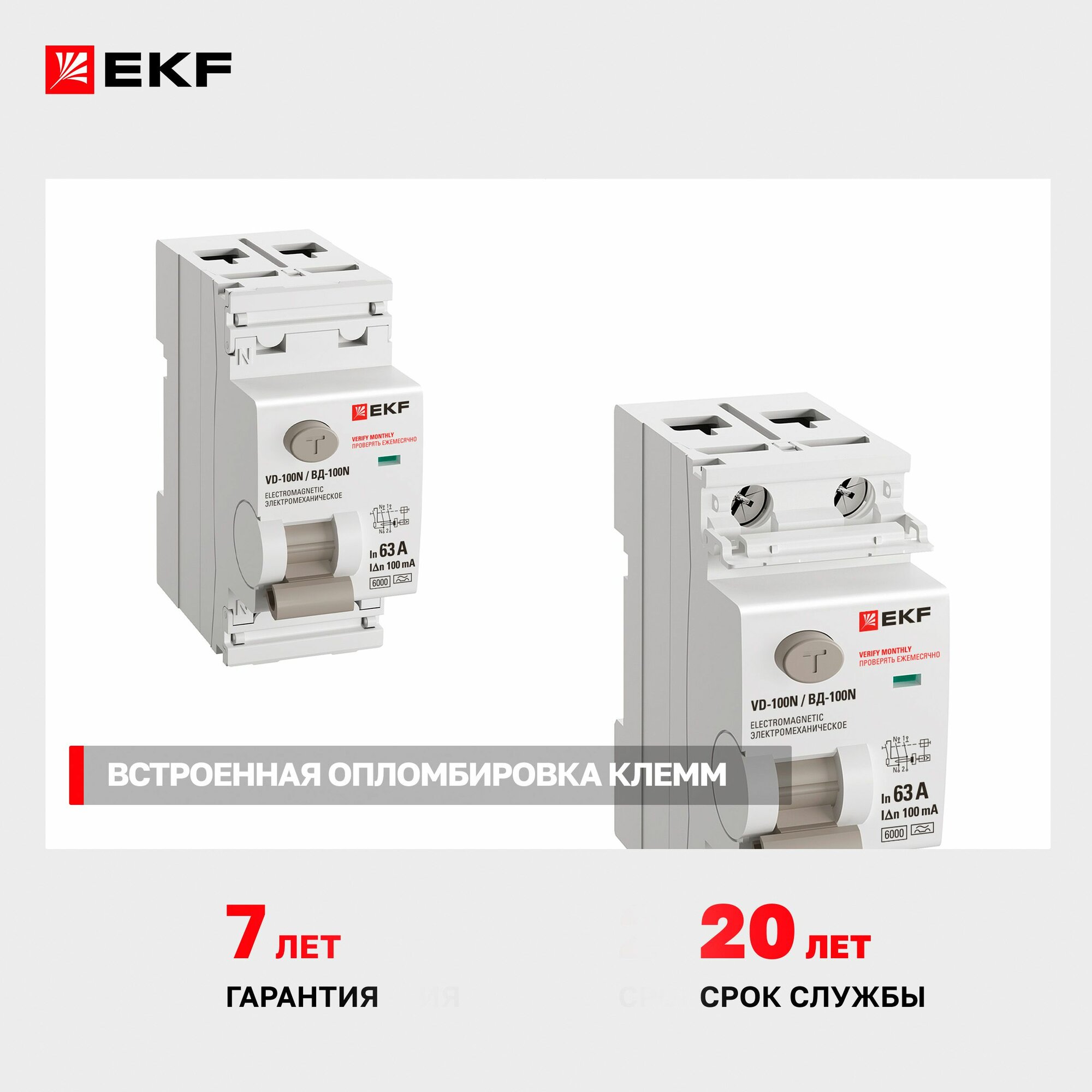 Купить УЗО 63А, ток утечки 100мА, тип A, двухполюсное 2P, 6кА , EKF PROXIMA ВД-100N дифференциальный выключатель - устройство защитного отключения