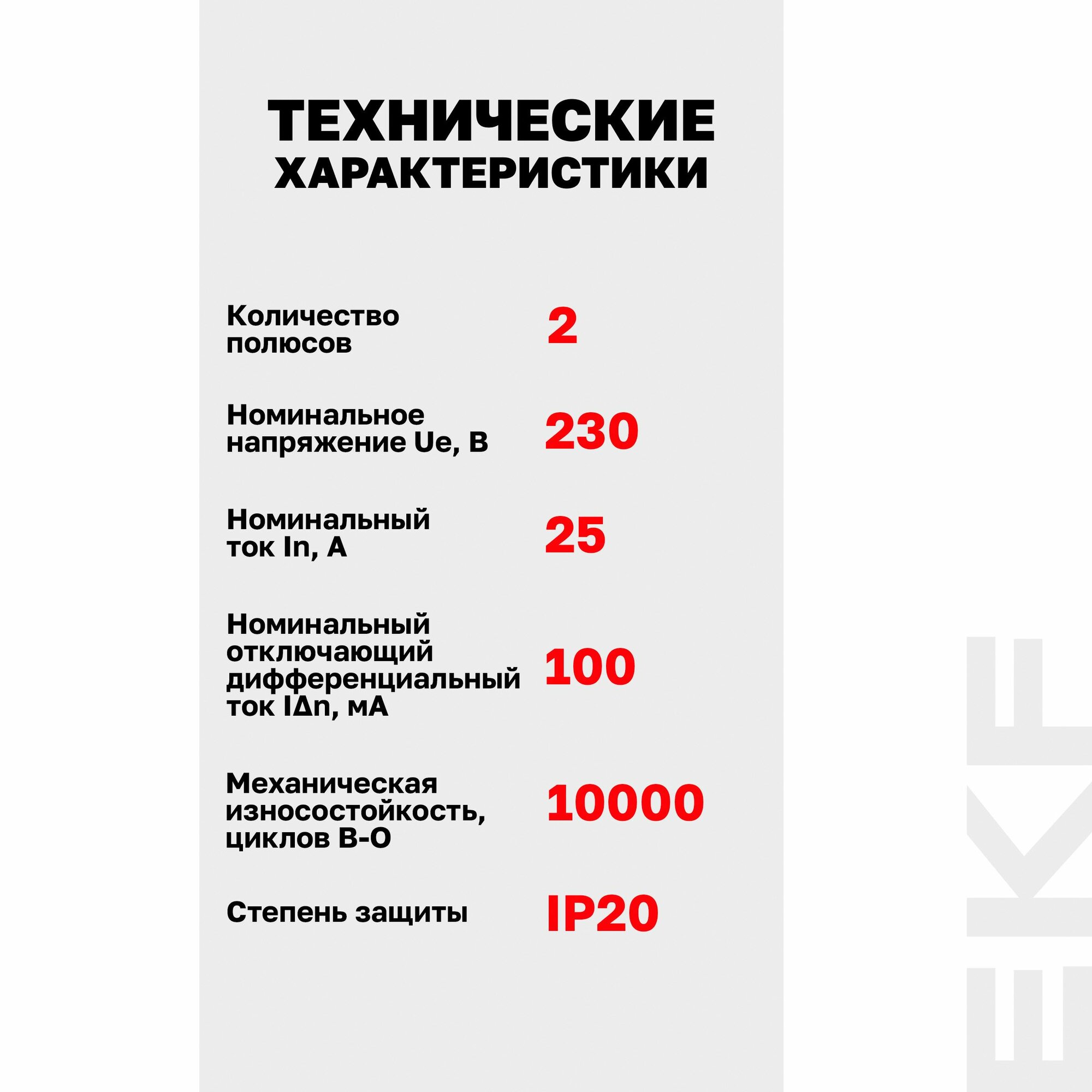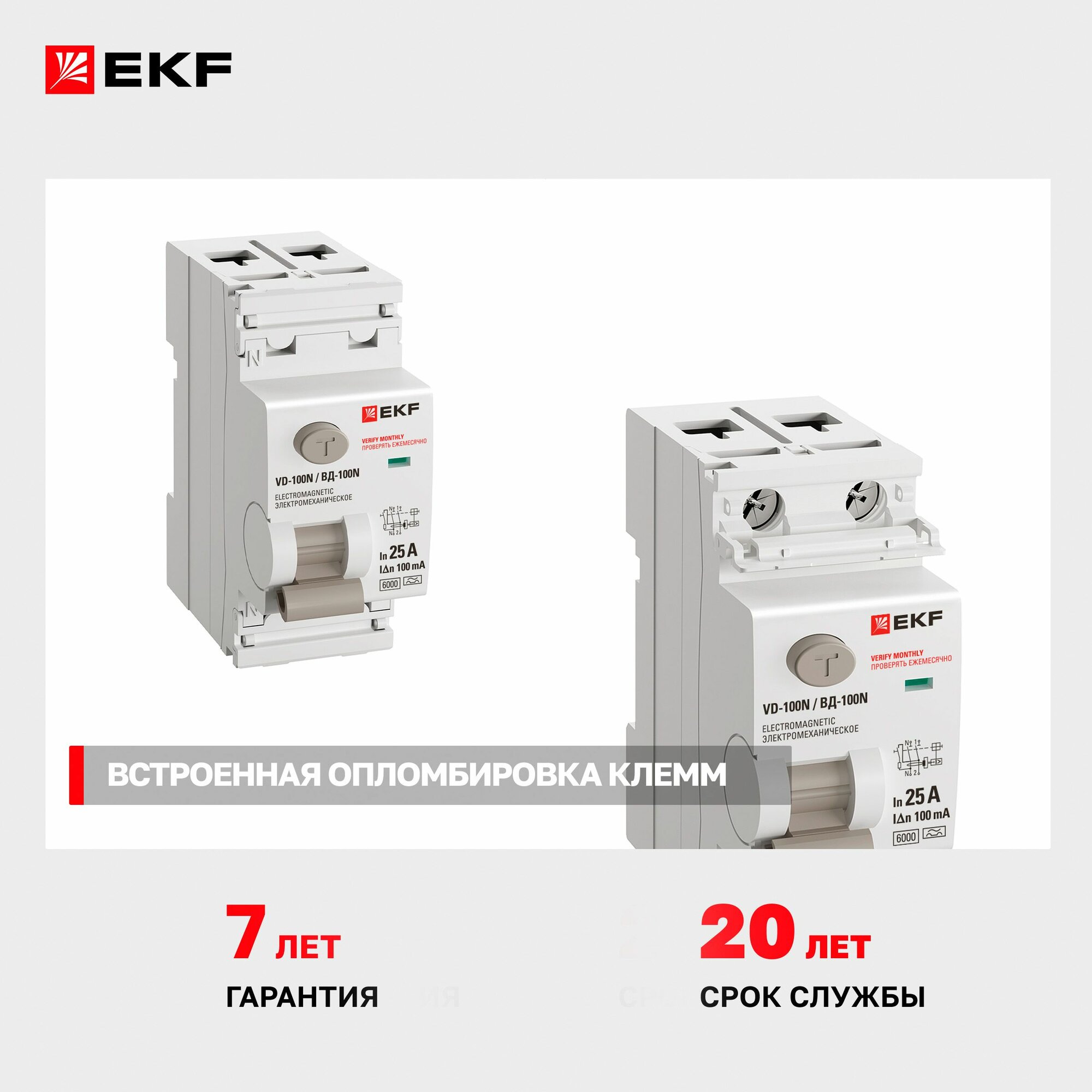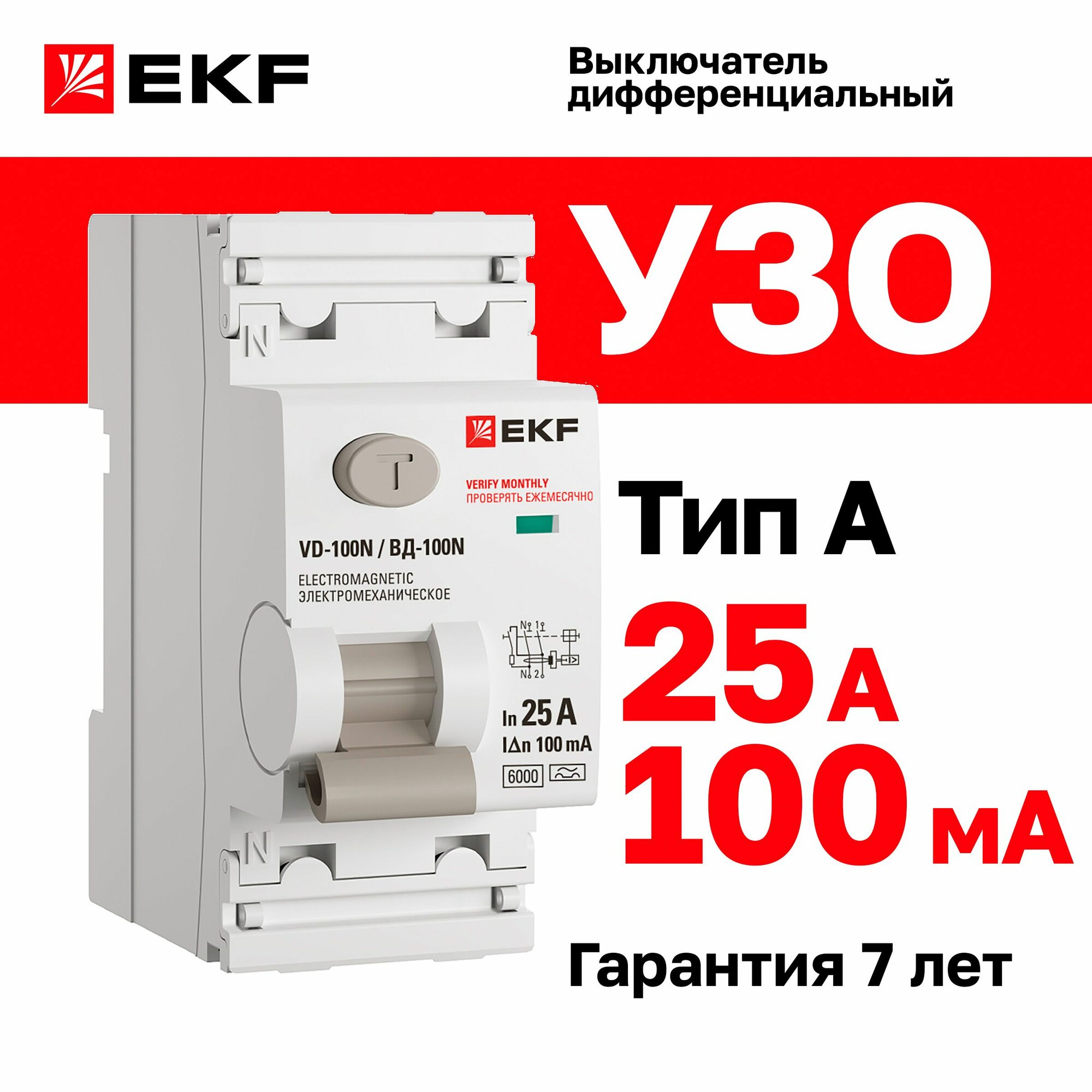 Купить УЗО 25А, ток утечки 100мА, тип A, двухполюсное 2P, 6кА , EKF PROXIMA ВД-100N дифференциальный выключатель - устройство защитного отключения