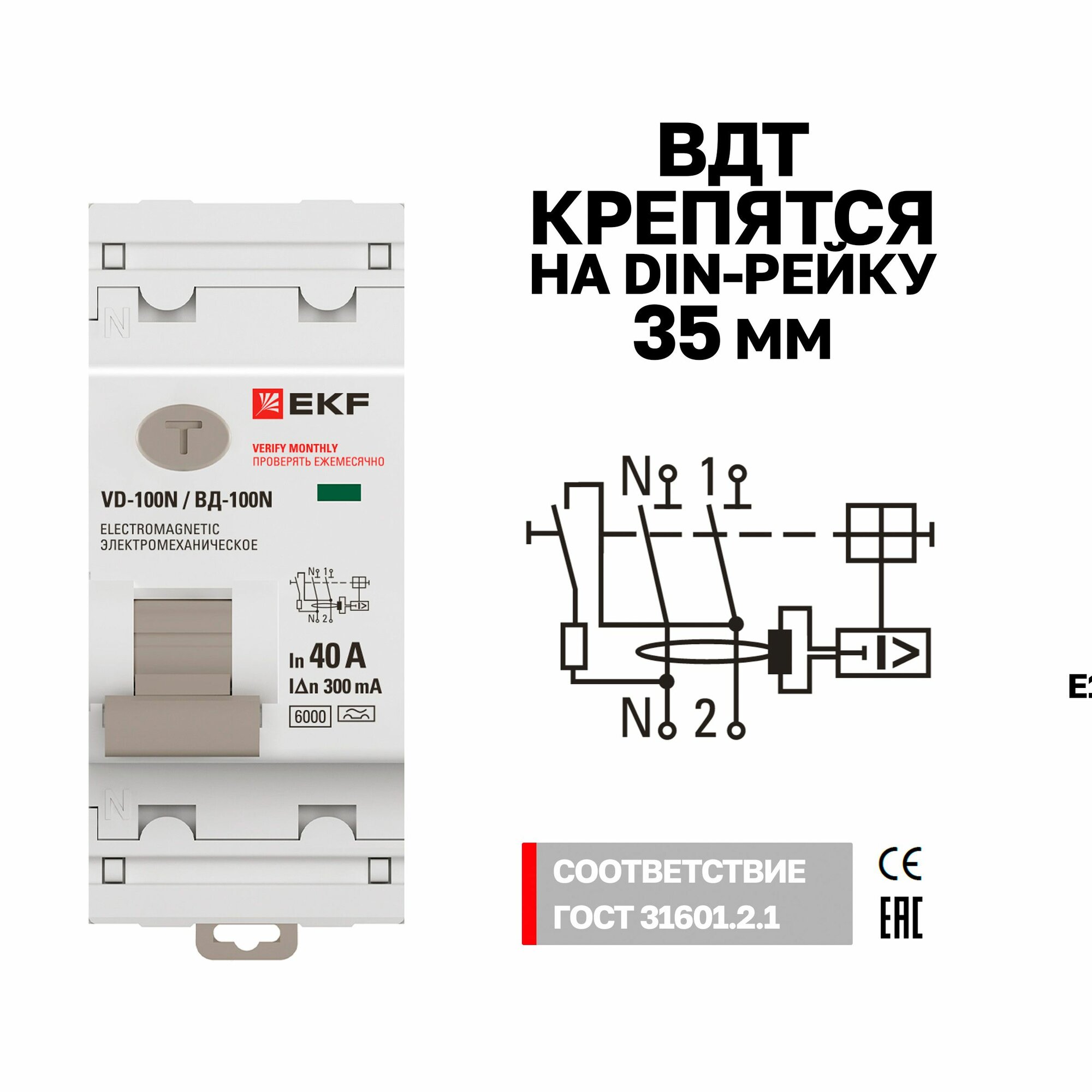 Купить УЗО 40А, ток утечки 300мА, тип A, двухполюсное 2P, 6кА , EKF PROXIMA ВД-100N дифференциальный выключатель - устройство защитного отключения