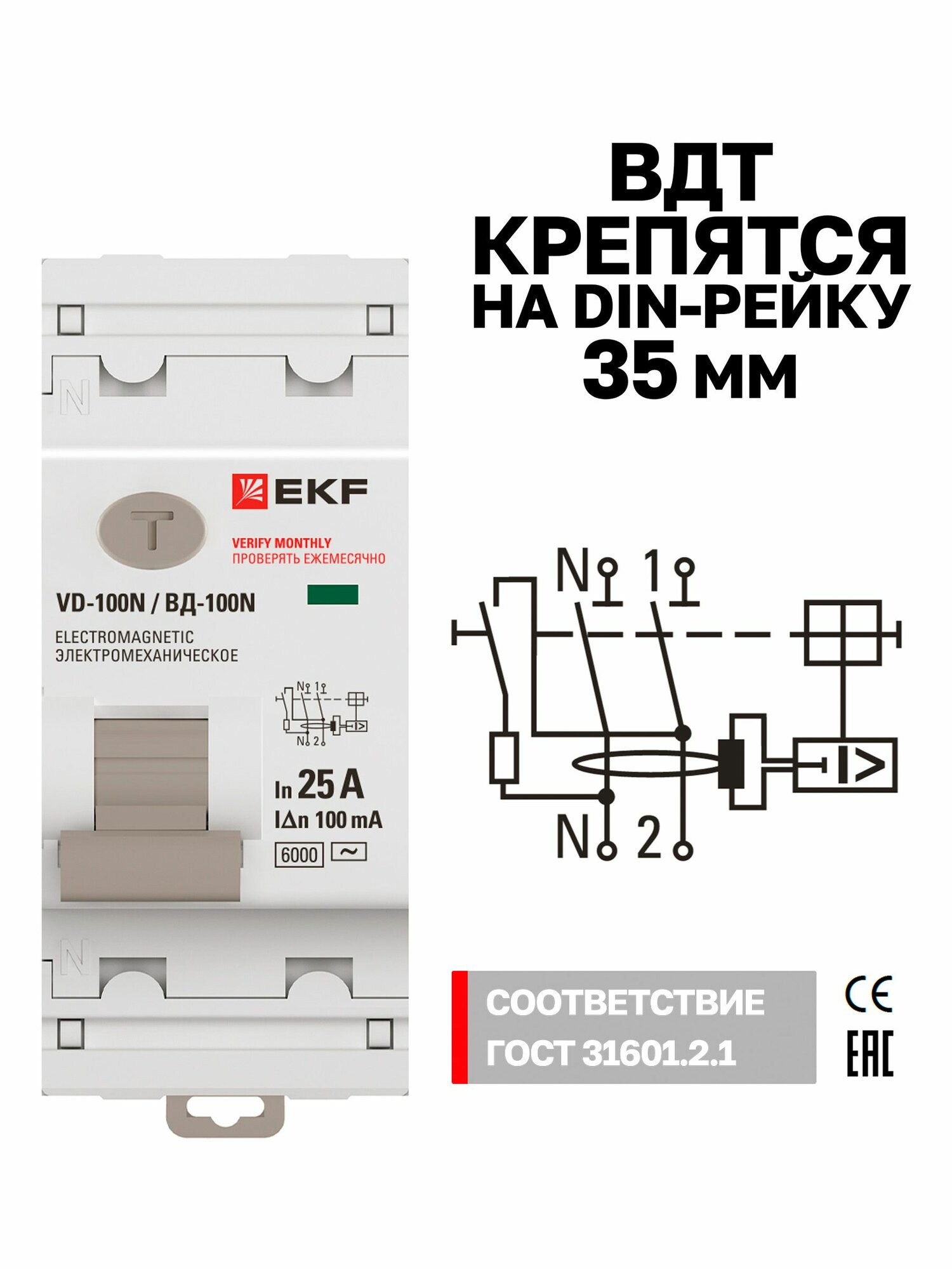 УЗО 25А, ток утечки 10мА, тип AC, двухполюсное 2P, 6кА , EKF PROXIMA ВД-100N дифференциальный выключатель - устройство защитного отключения