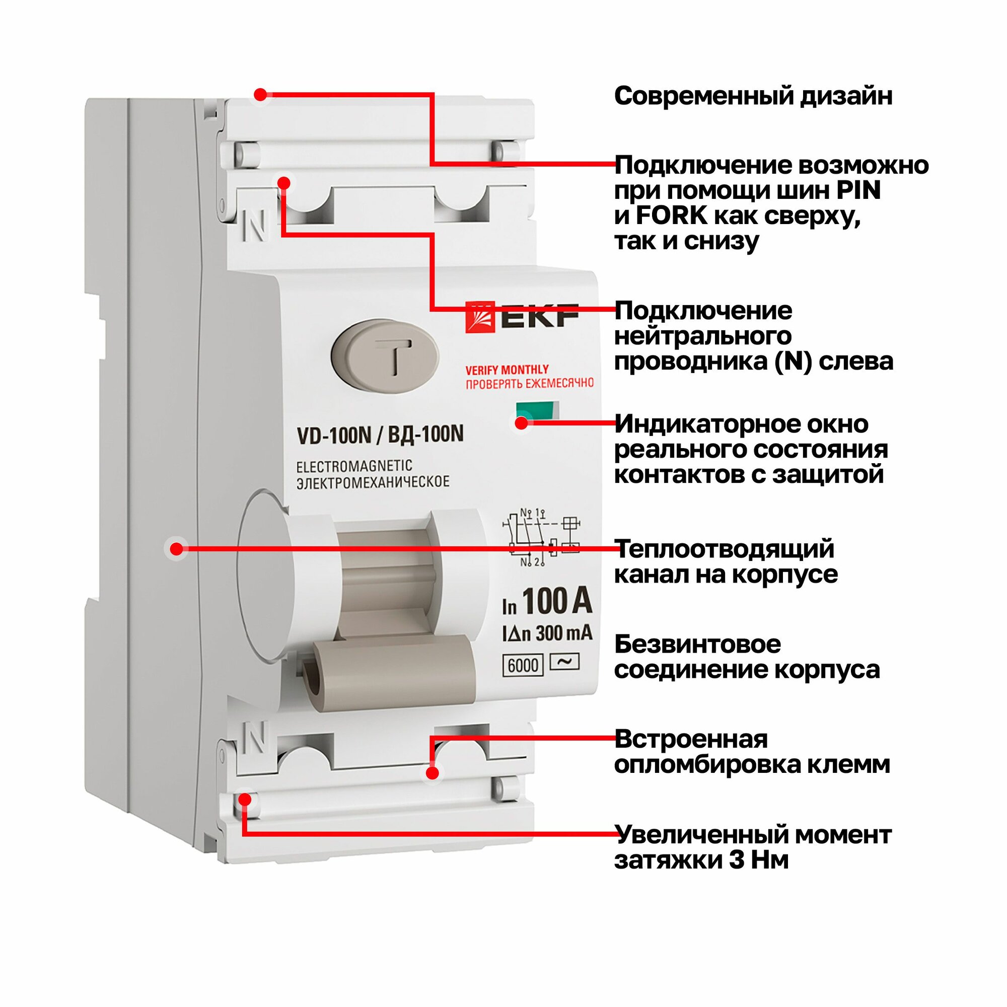 УЗО 100А, ток утечки 100мА, тип AC, двухполюсное 2P, 6кА , EKF PROXIMA ВД-100N дифференциальный выключатель - устройство защитного отключения
