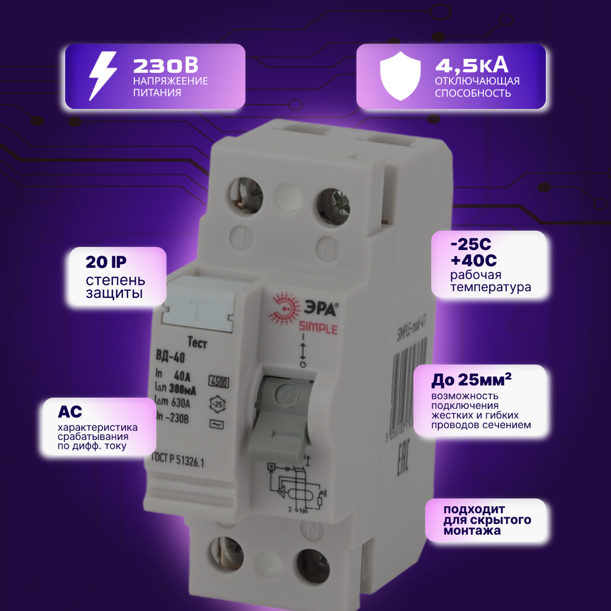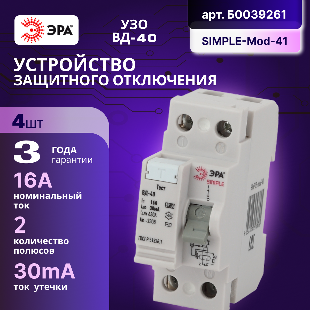 Выключатель диф тока УЗО 2P (2П) 16А 30 мА АС электронное SIMPLE-mod-41 ВД-40 Б0039261 Эра 4шт интересное: