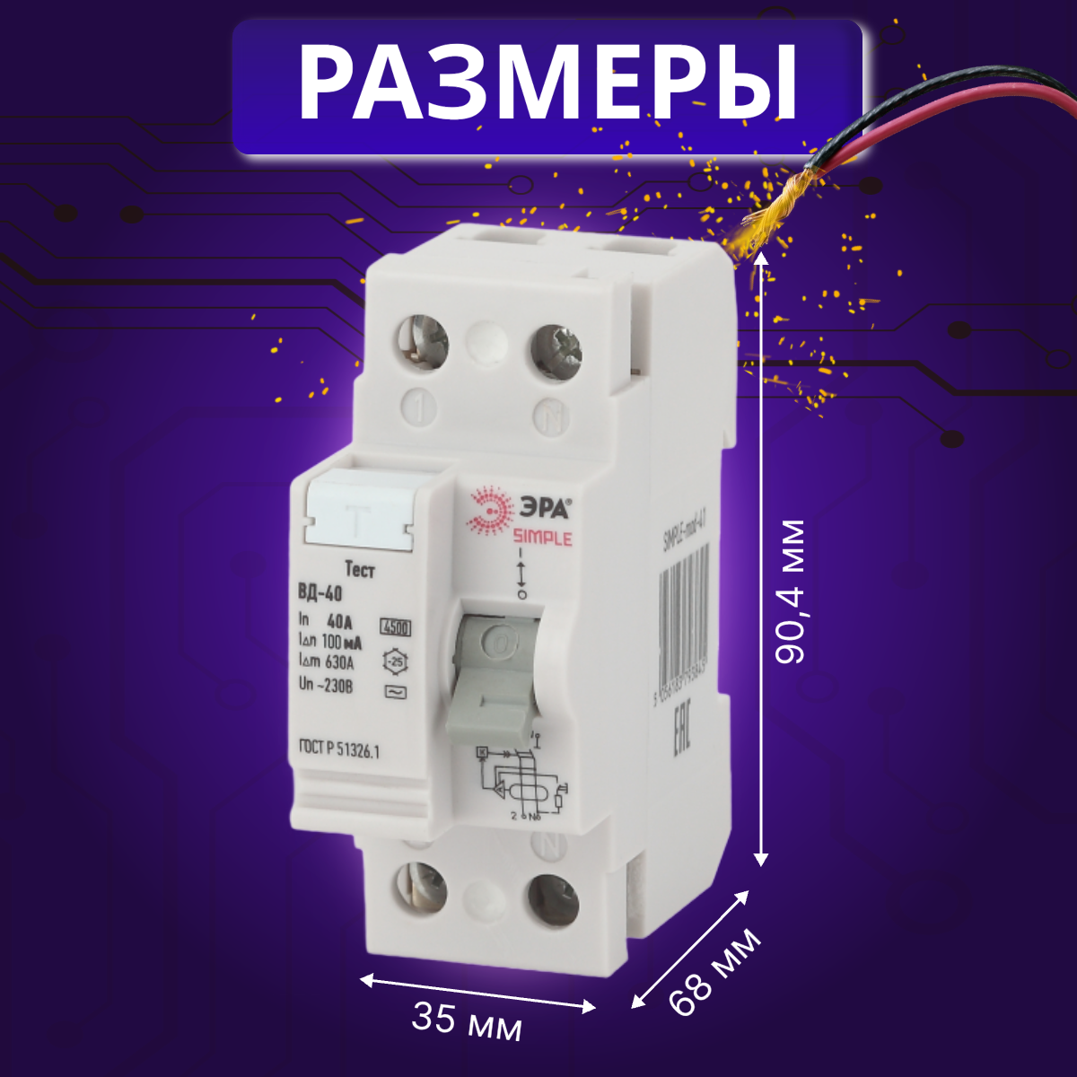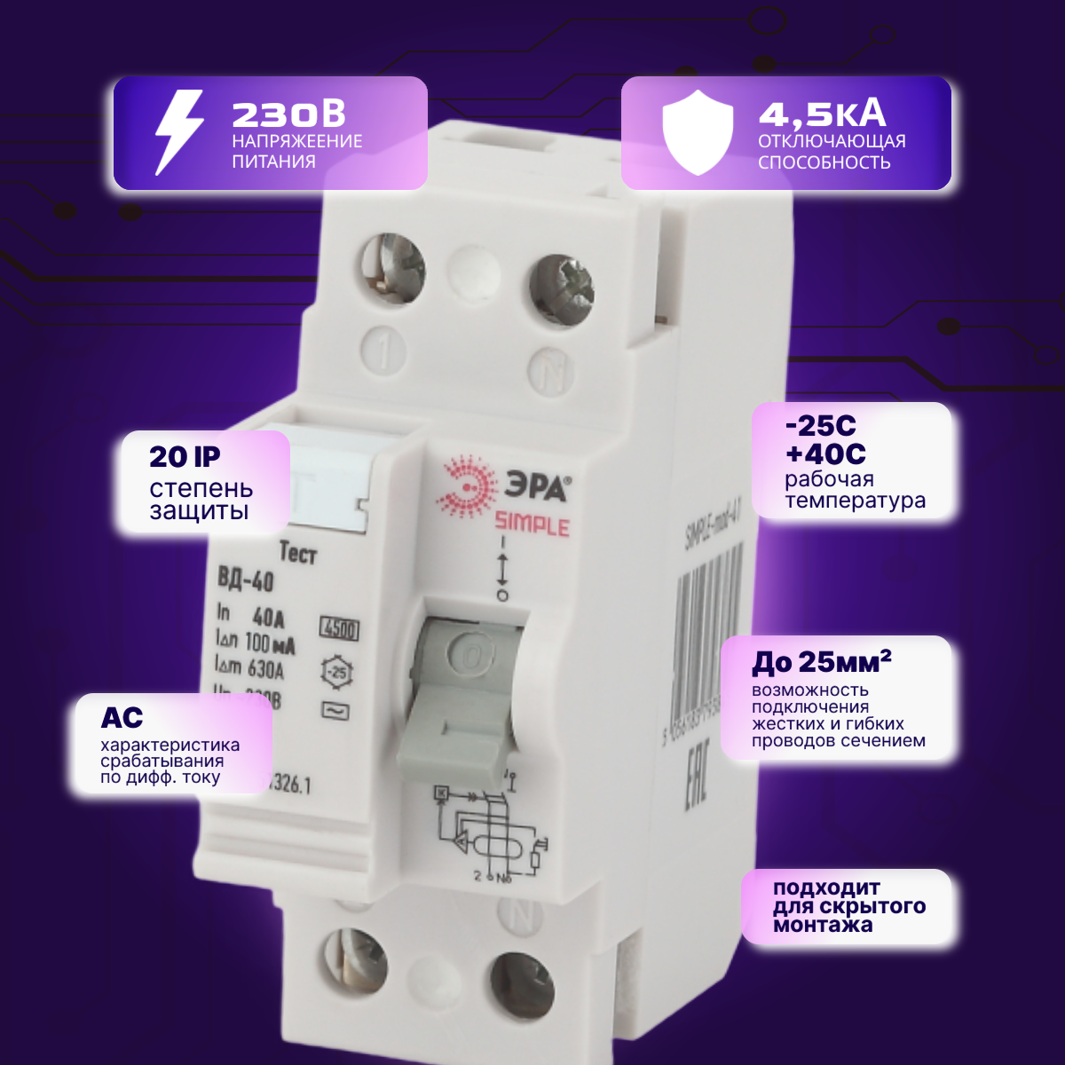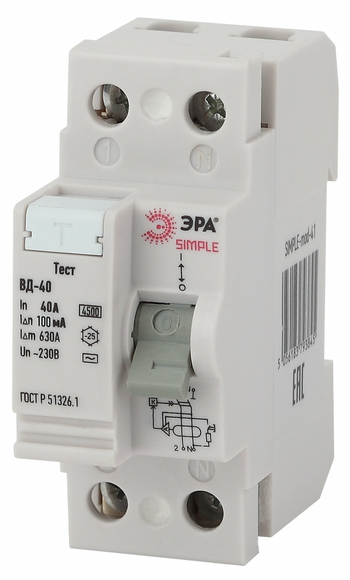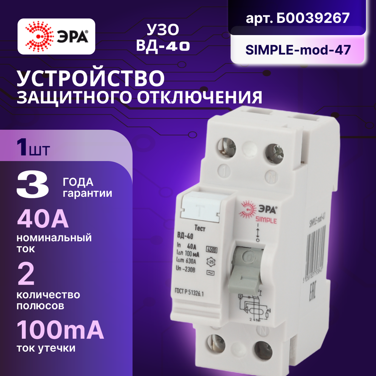 Выключатель диф тока УЗО 2P (2П) 40А 100 мА АС электронное SIMPLE-mod-47 ВД-40 Б0039267 Эра 1шт интересное: