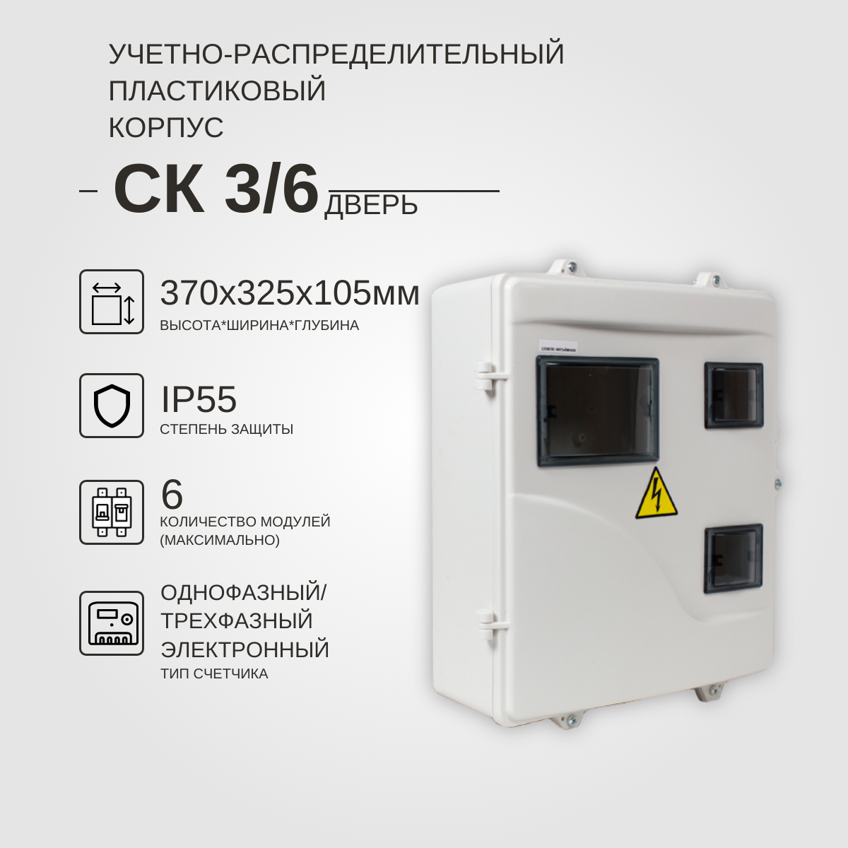 Учетно-распределительный щит СК 3/6 дверь IP55 KRZMI, пластиковый, навесной. ВхШхГ: 370х325х105мм. интересное: