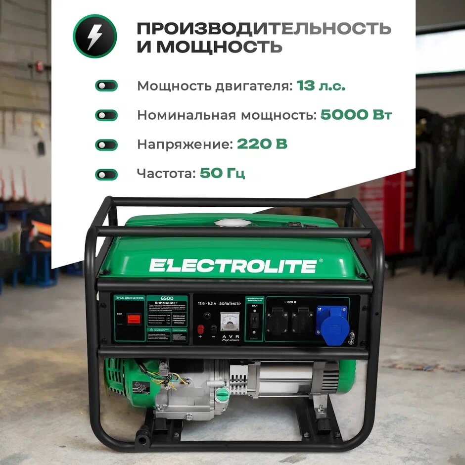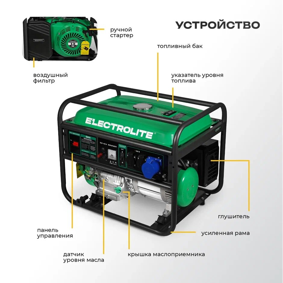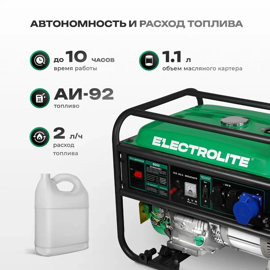 Генератор бензиновый Electrolite 6500 ( 6,5 кВт, 10ч работы, 25л объём бака, 74дб, ручной стартер ) интересное: