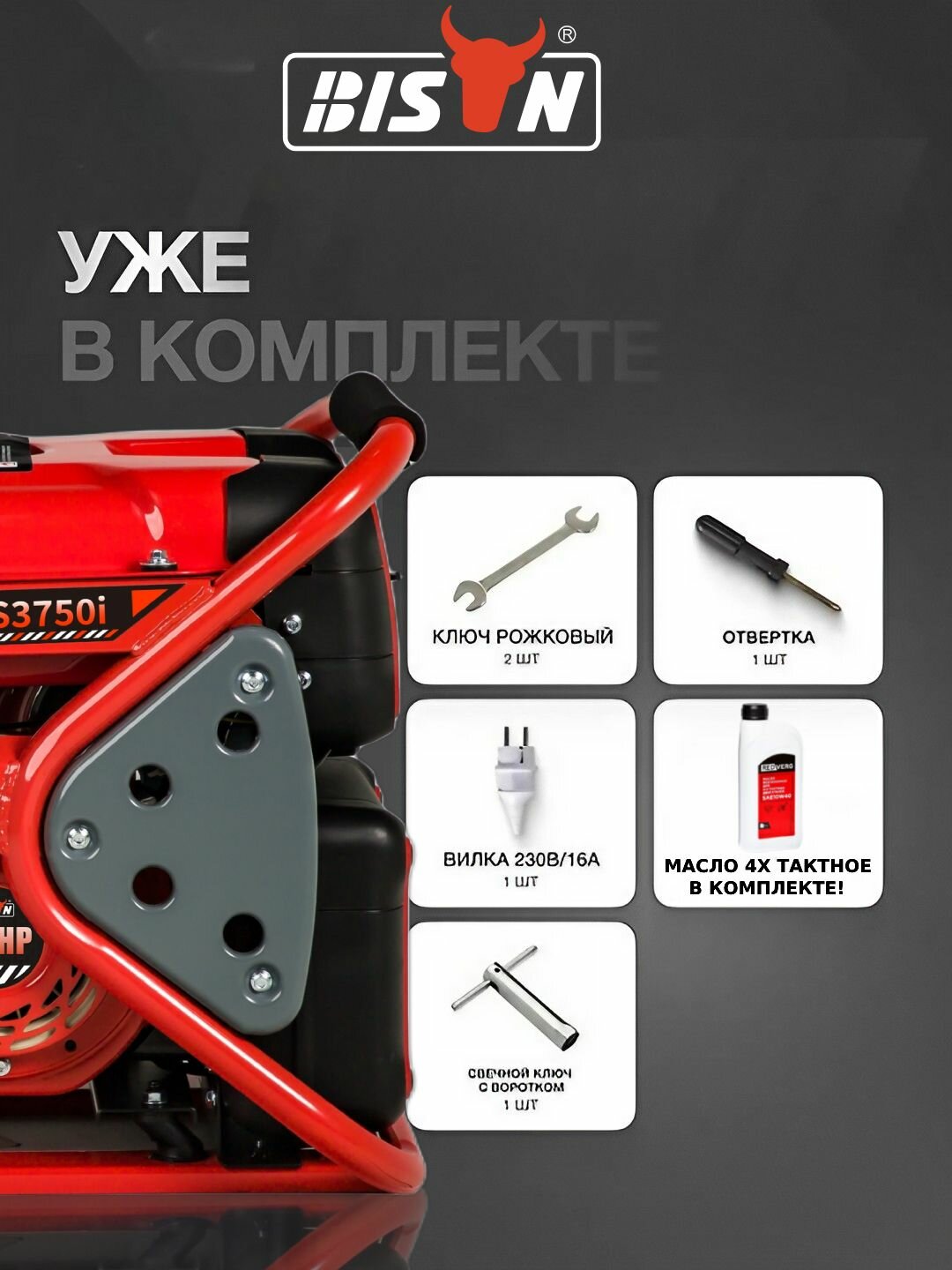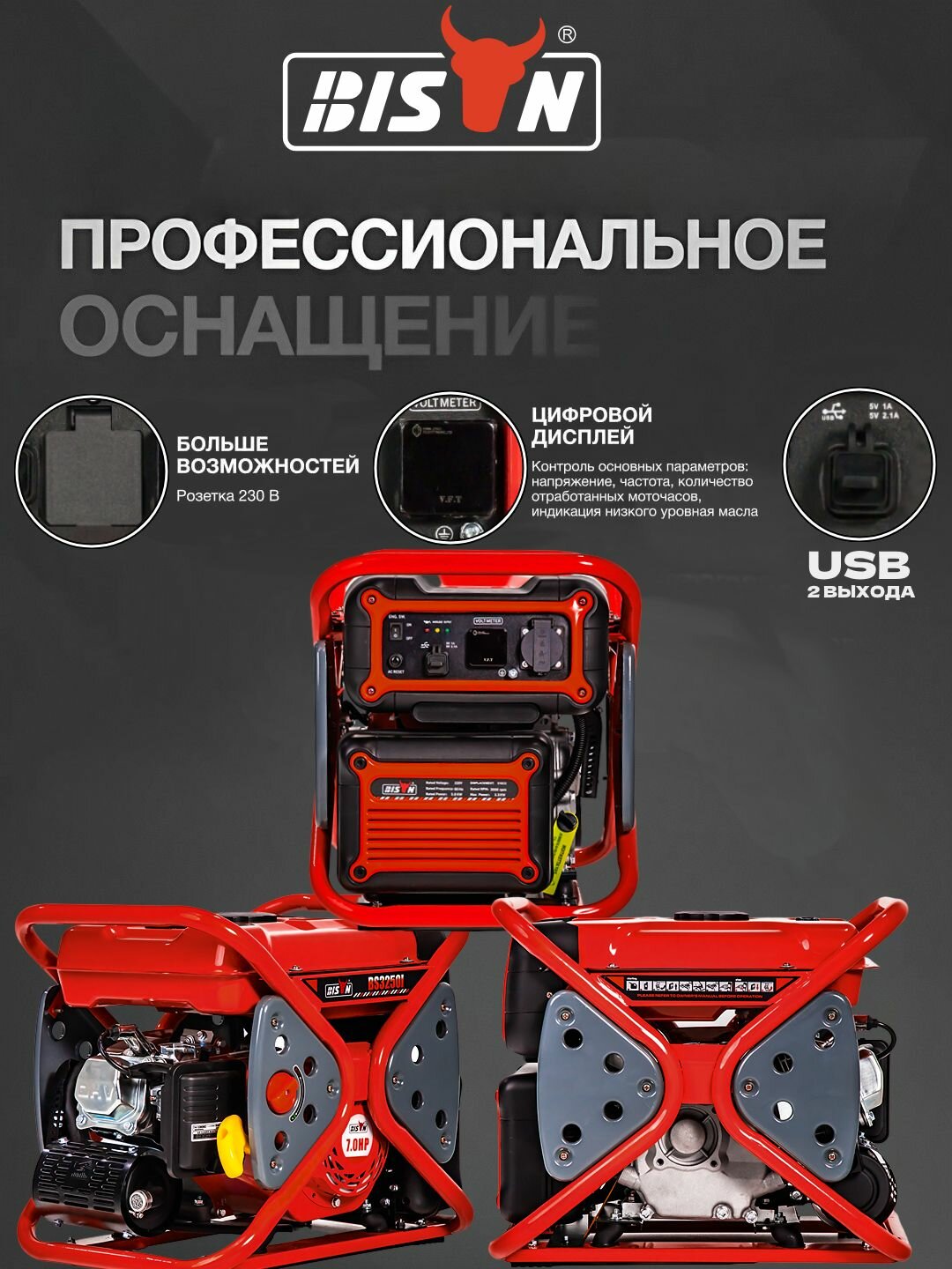 Инверторный генератор BS3750IX BISON, 3,7кВт, 230Вт, 1 розетка 220V, 1 USB-розетка