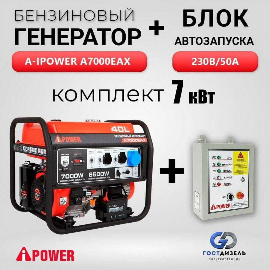 Купить Комплект генератор бензиновый A-iPower A7000EAX (7 кВт/230В) + блок АВР 230В. Выдерживает пусковые токи до 14 кВA