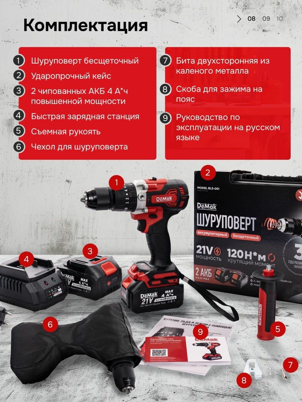 Шуруповерт аккумуляторный бесщеточный DeMak, 21В, 3 часа работы, 2 АКБ. Дрель-шуруповерт интересное: