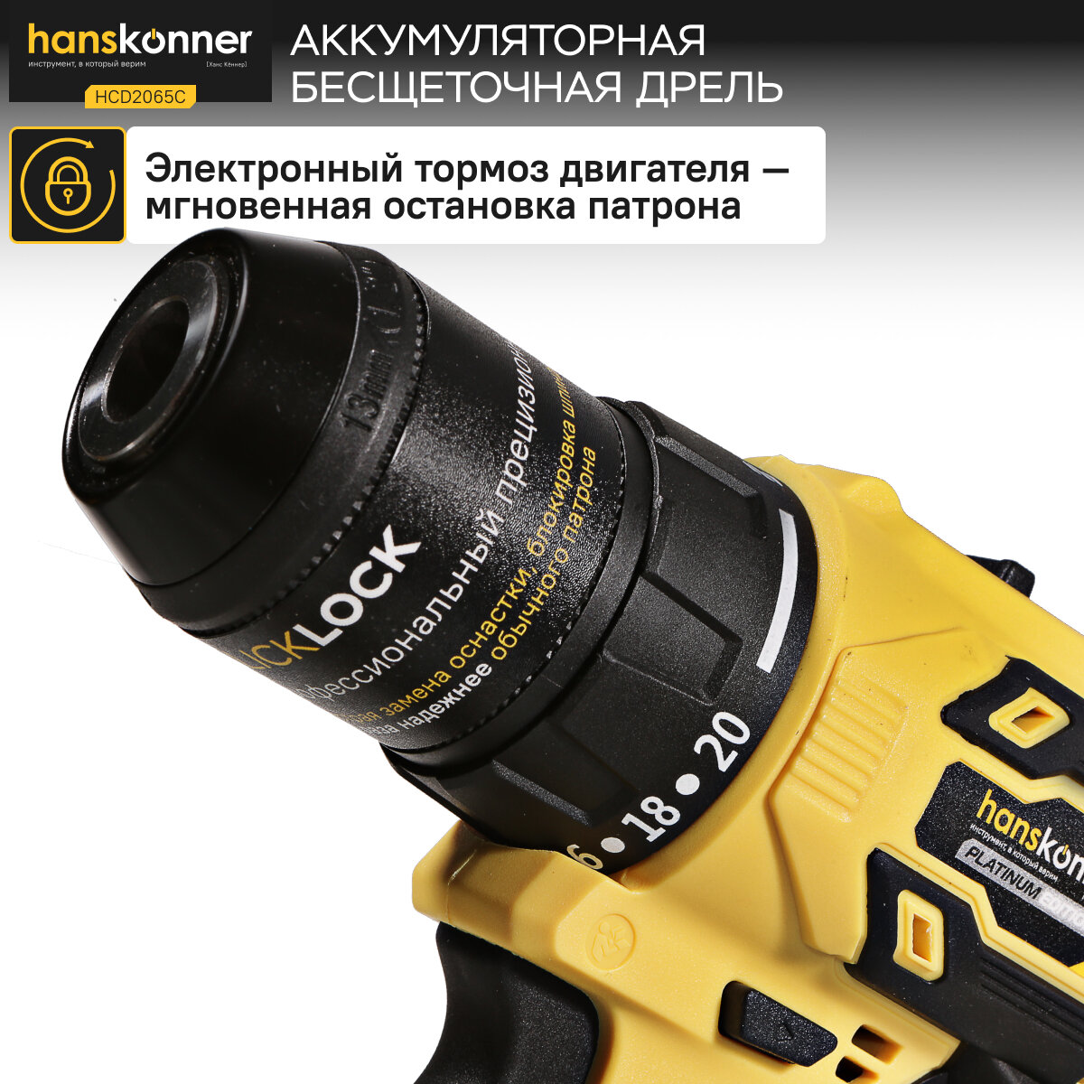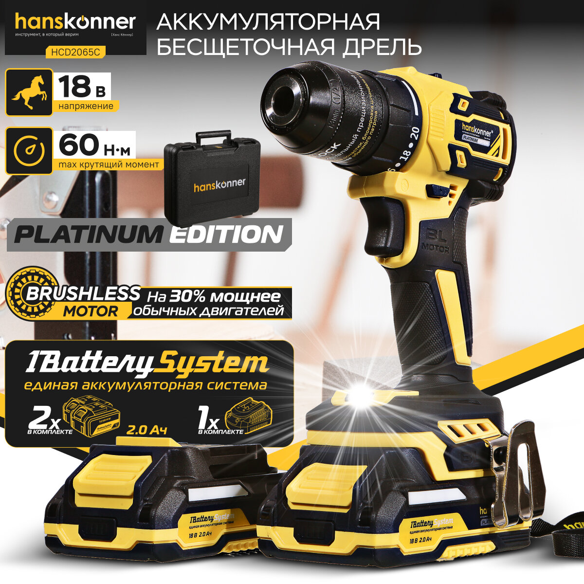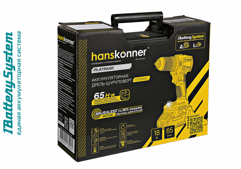 Шуруповерт аккумуляторный Hanskonner HCD2065C 18В, 1BatterySystem,60Нм, пл. патрон, 2х2Ач, кейс, бесщеточный интересное: