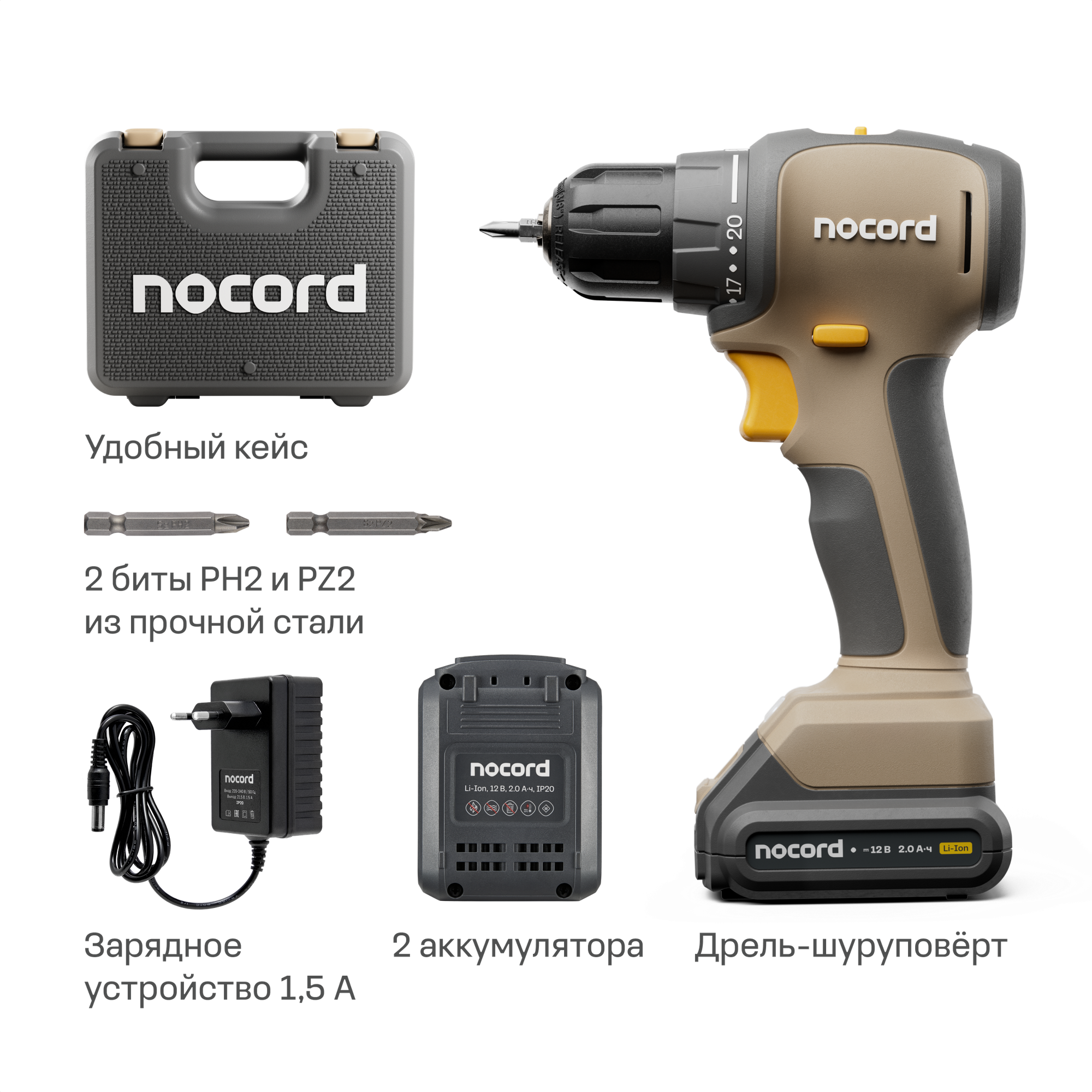 Аккумуляторная бесщеточная дрель-шуруповерт Nocord, 12В, 2х2 А·ч Li-Ion, в кейсе, NBD-12.2.20. D интересное: