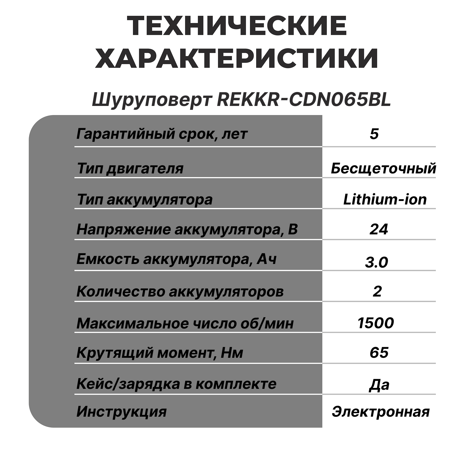 СохранитьДрель-шуруповерт бесщеточный REKKR CDN065BL, 65Нм, 2 аккумулятора 24В 3.0Ач, патрон 10мм, кейс с набором, зарядка интересное:
