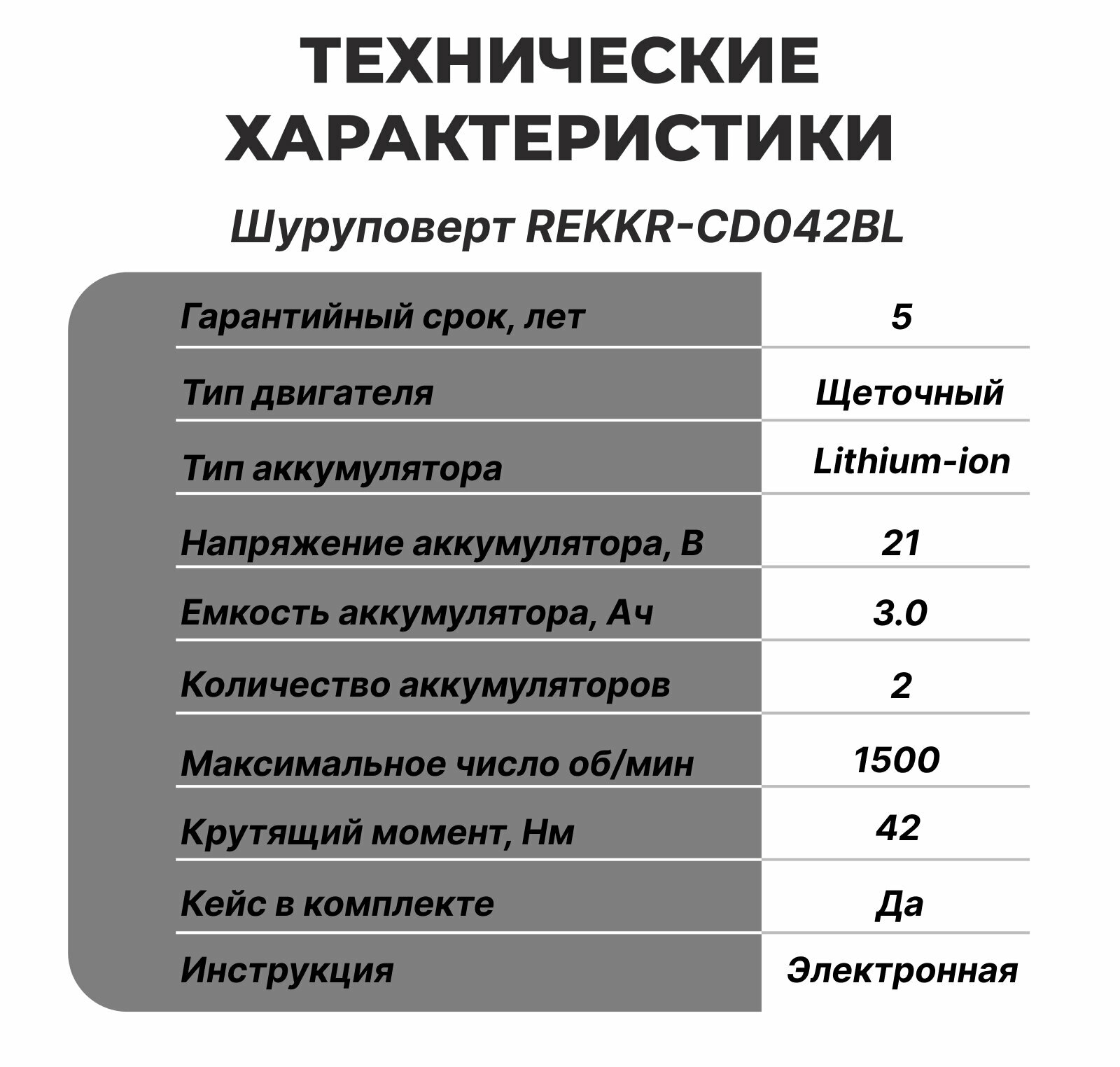 СохранитьДрель-шуруповерт аккумуляторный REKKR CD042BL, 42Нм, 2 аккумулятора 21В 3.0Ач, патрон 10мм, кейс с набором, зарядка интересное: