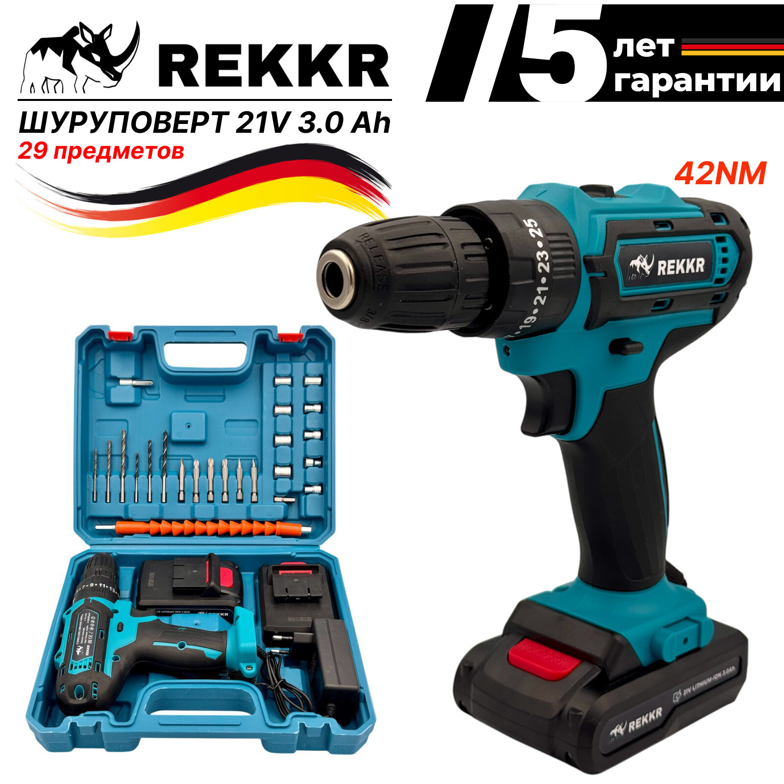 Купить Дрель-шуруповерт аккумуляторный REKKR CD042BL, 42Нм, 2 аккумулятора 21В 3.0Ач, патрон 10мм, кейс с набором, зарядка