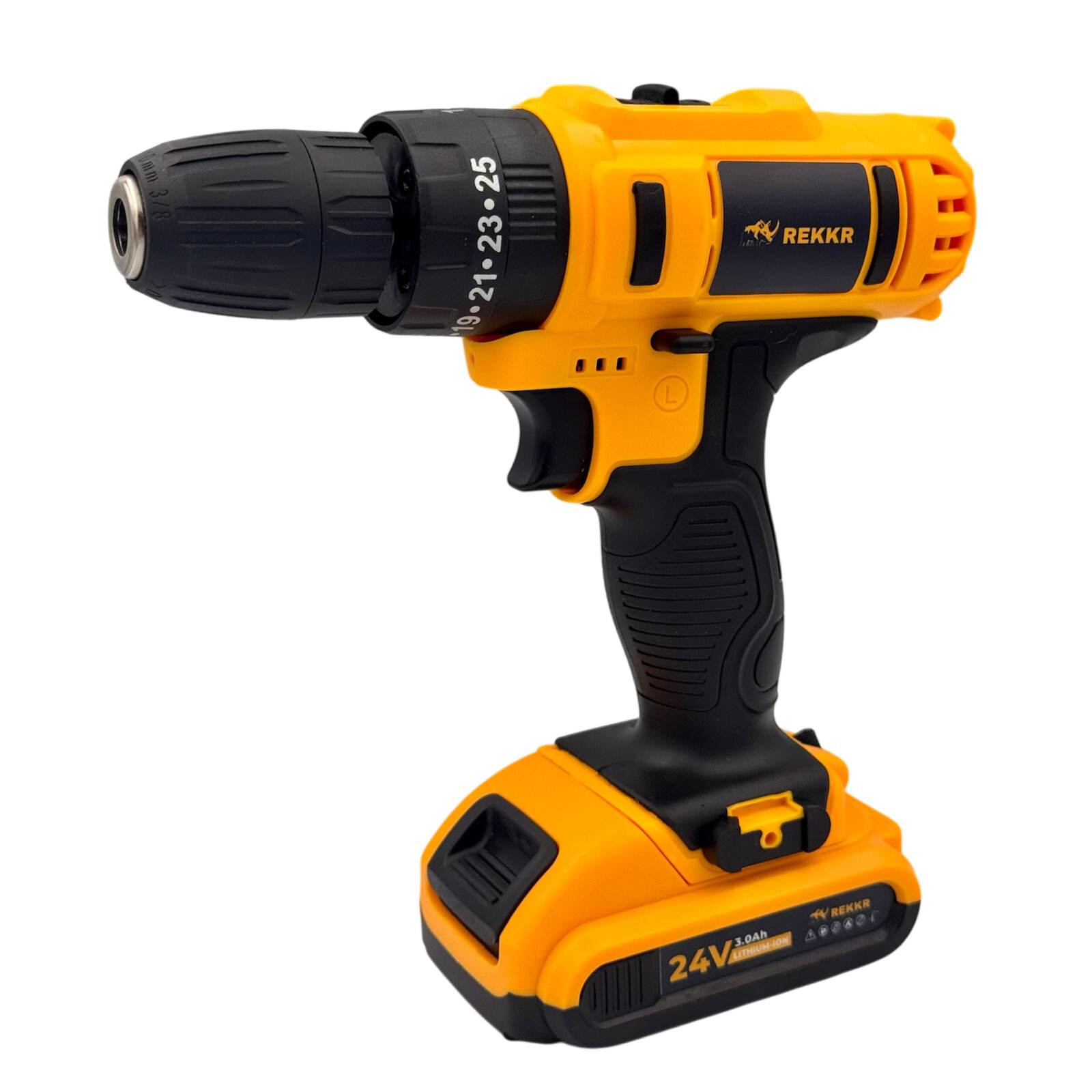 Купить Дрель-шуруповерт аккумуляторный REKKR CDN048YL, 48Нм, 2 аккумулятора 24В 3.0Ач, патрон 10мм, кейс с набором, зарядка