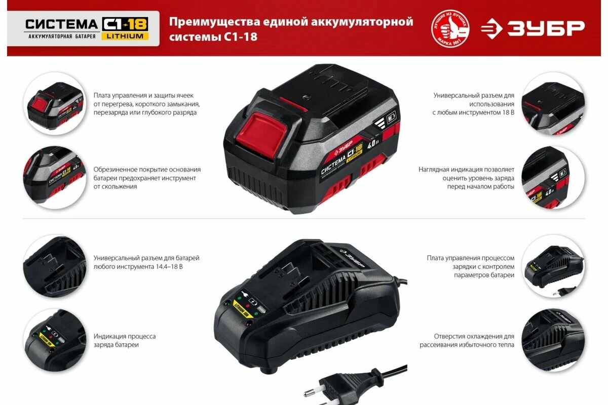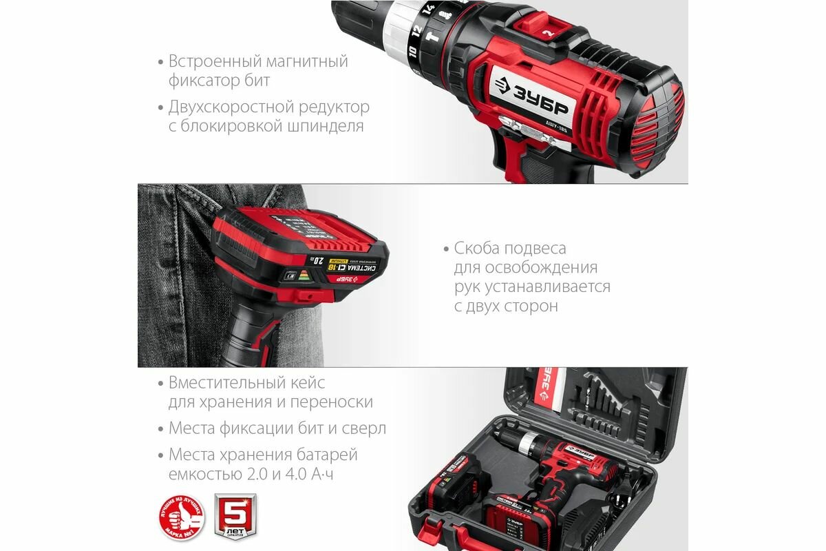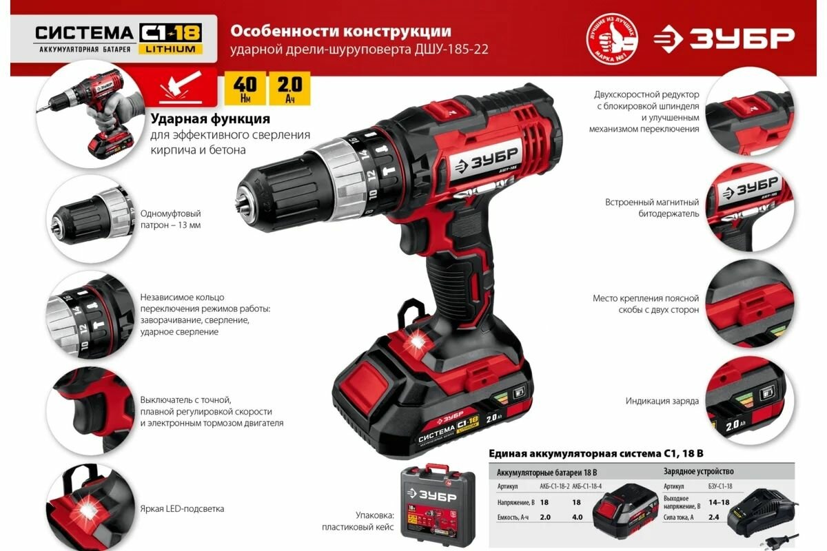 Ударная дрель-шуруповерт, кейс ЗУБР ДШУ-185-22, С1-18, 18 В, 40 Нм, 2АКБ (2 Ач) интересное: