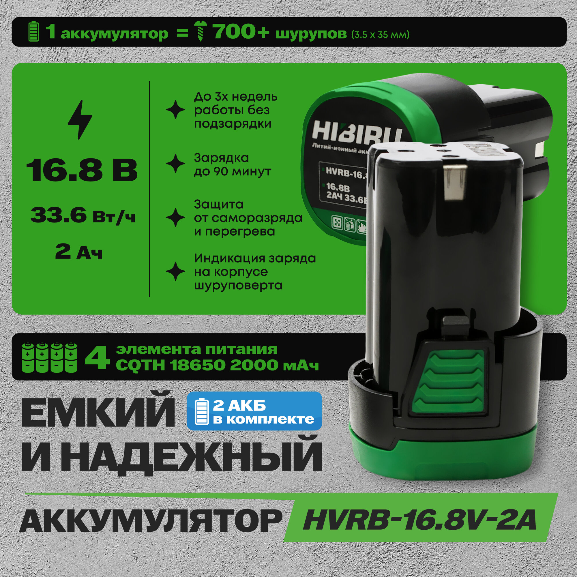 Бесщеточный аккумуляторный шуруповерт 16.8В 55Нм 2Ач / HIBIRU, блокировка шпинделя, металлический патрон, кейс, оснастка
